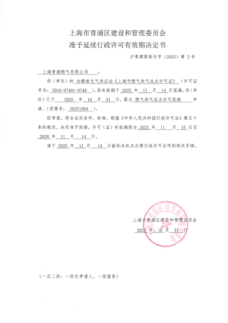 上海市青浦区建设和管理委员会准予延续行政许可有效期决定书