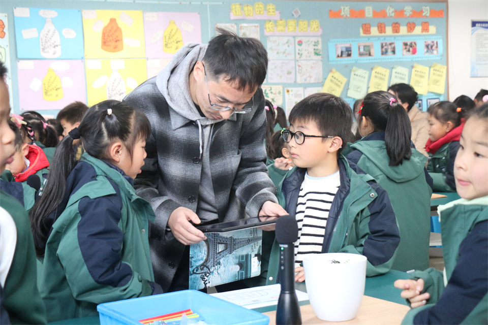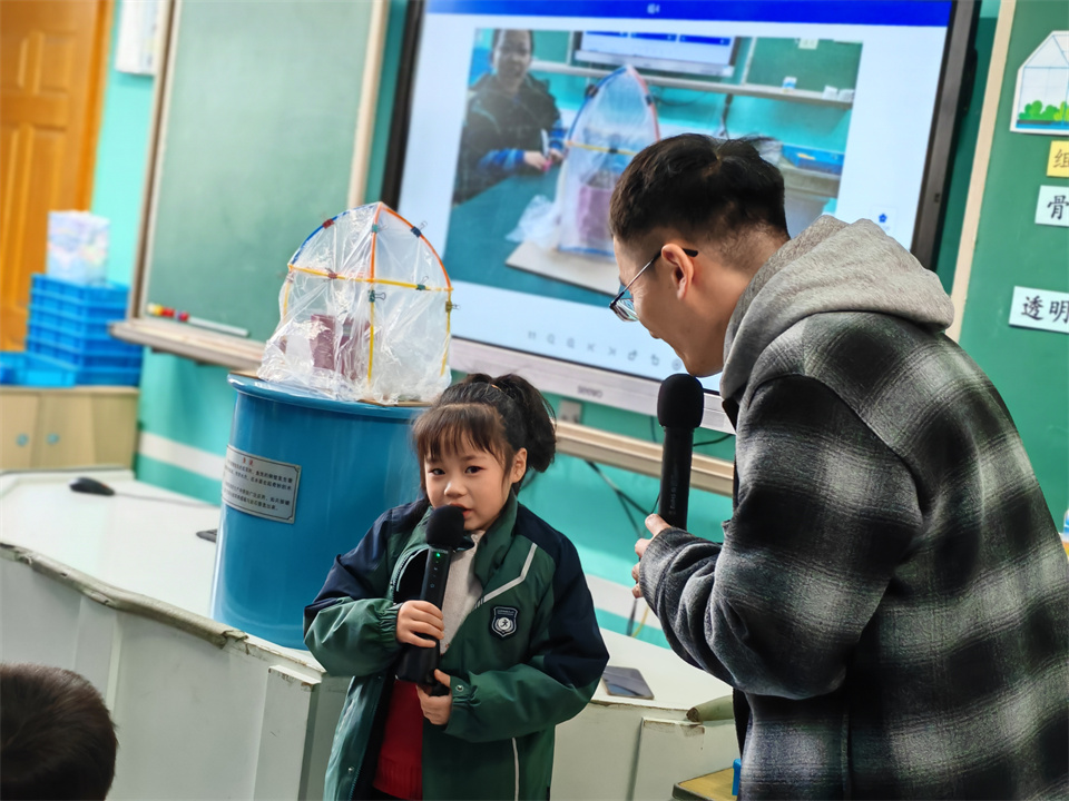 随后,佳禾小学朱磊老师进行了一年级《播撒菜籽观生长,巧手搭棚御寒霜——制作植物暖棚》项目第五课时的教学展示。课堂上,朱老师以真实生活情境为切入点,引导学生完整经历了工程与技术类作业的“设计方案—动手制作—优化改进—成果展示”的项目式学习流程,既践行了“做中学、学中思”的教学理念,又着力培养学生的工程思维与实践能力,生动诠释了项目化学习在科学课堂中的有效应用,为参会教师提供了可借鉴的实践范例。