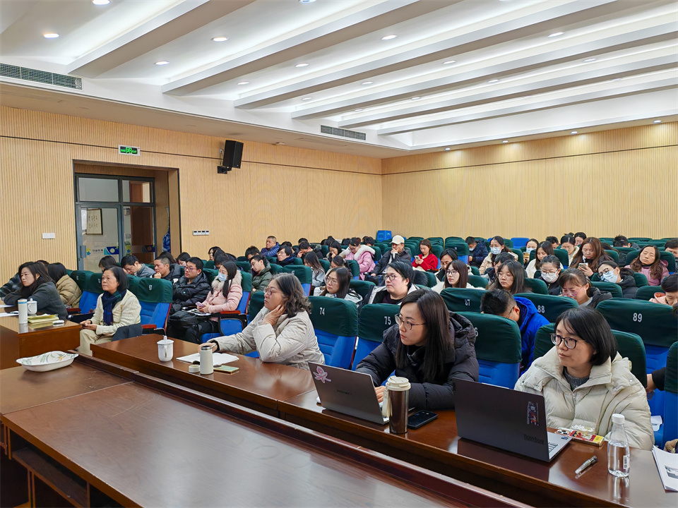 紧接着,参会人员移步至学校三楼多功能厅,上海市教师教育学院科学学科教研员沈慧丽老师作市新教材使用监测调研反馈主旨报告。报告从四大维度系统剖析区域科学课程实施现状:一是基本情况,涵盖区域学校布局、课时安排、师资配置等核心要素;二是经验与成效,重点梳理了新教材使用、实践性作业设计与实施中的亮点做法;三是问题与建议,针对资源保障、师资队伍建设、评价体系优化等短板提出改进方向;四是专项指导,聚焦实验教学规范、课堂互动效能提升给出具体建议,为区域科学教育高质量发展指明了路径。