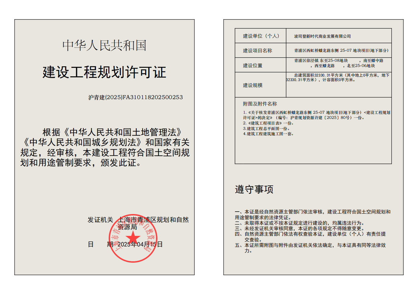 根据《中华人民共和国城乡规划法》、《上海市城乡规划条例》等有关规定,现对沪青建(2025)FA310118202500253建设工程规划许可证及其总平面图进行公开。
