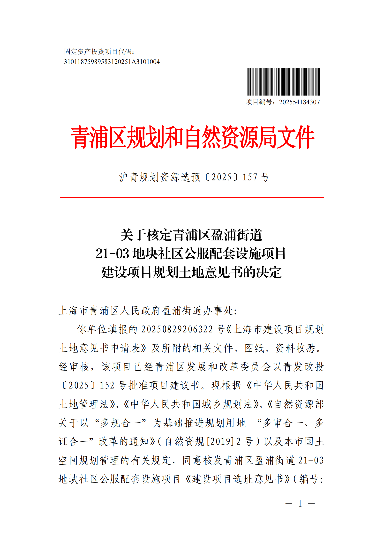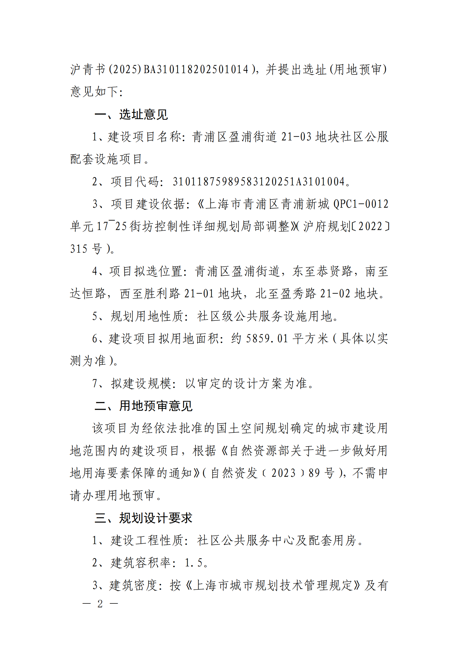 沪青书(2025)BA310118202501014建设项目用地预审与选址意见书(青浦区盈浦街道21-03地块社区公服配套设施项目)