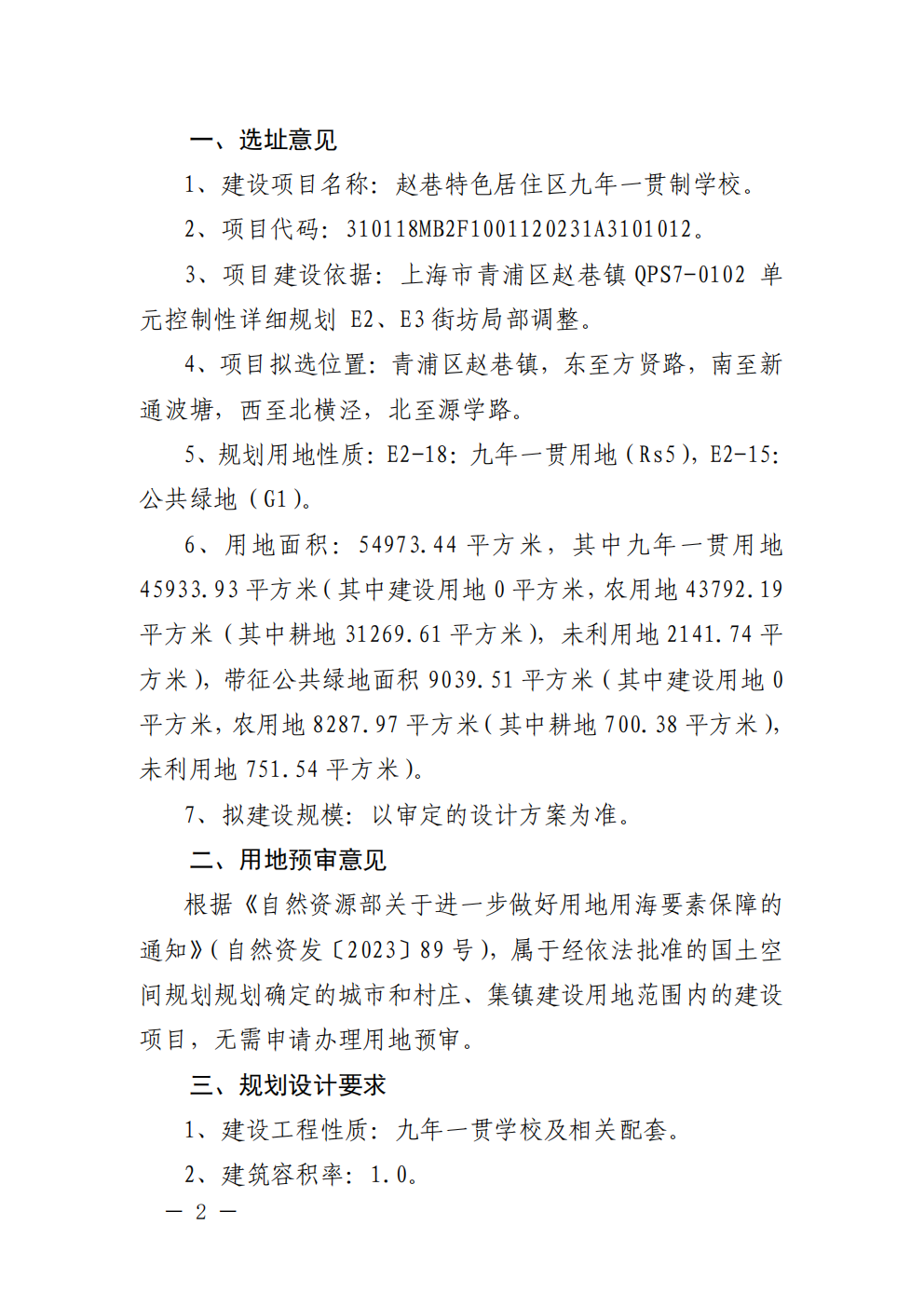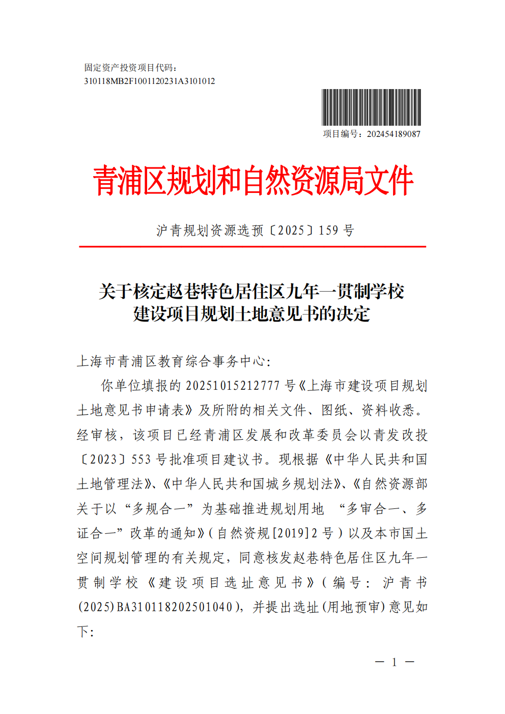 沪青书(2025)BA310118202501040建设项目用地预审与选址意见书(赵巷特色居住区九年一贯制学校)