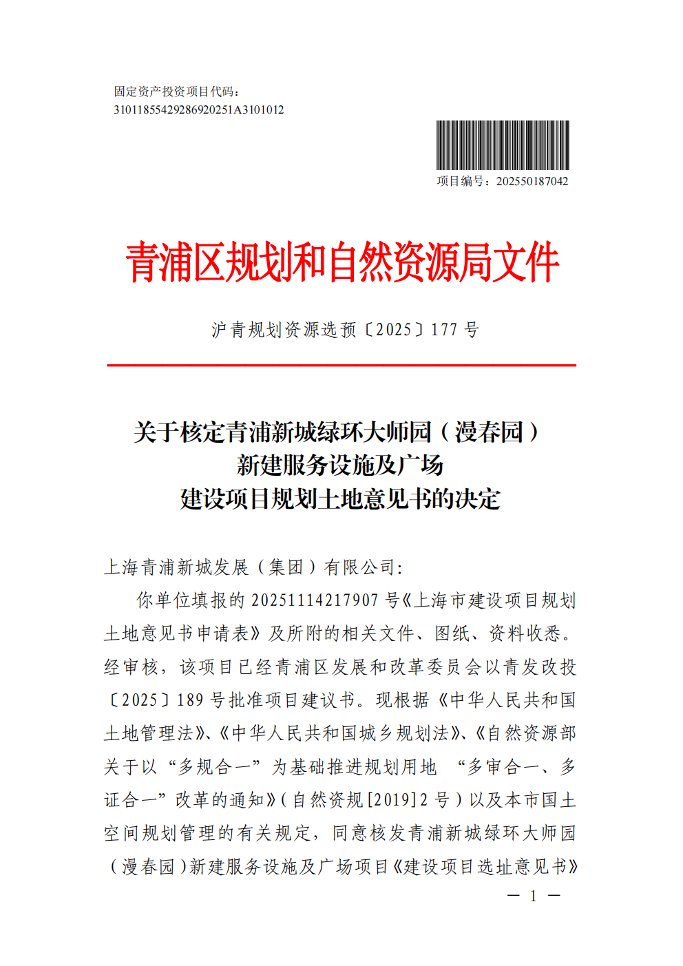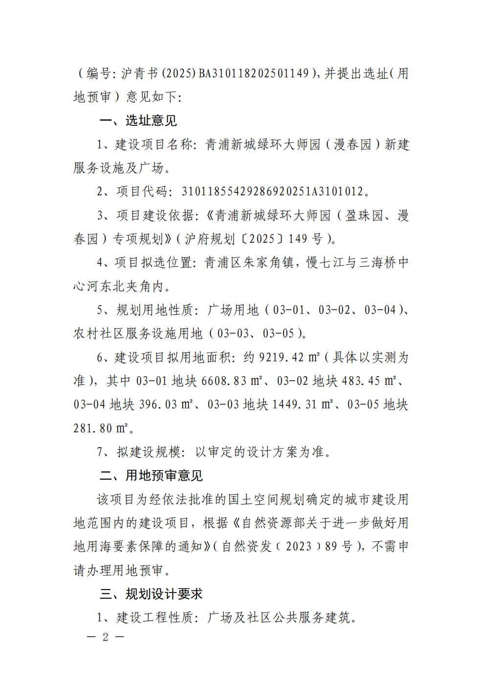 沪青书(2025)BA310118202501149建设项目用地预审与选址意见书(上海青浦新城发展(集团)有限公司)