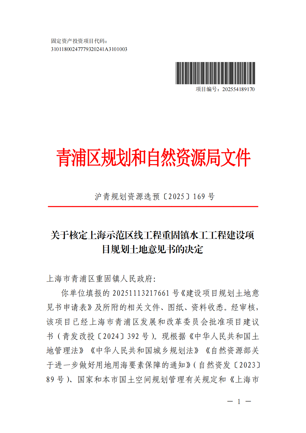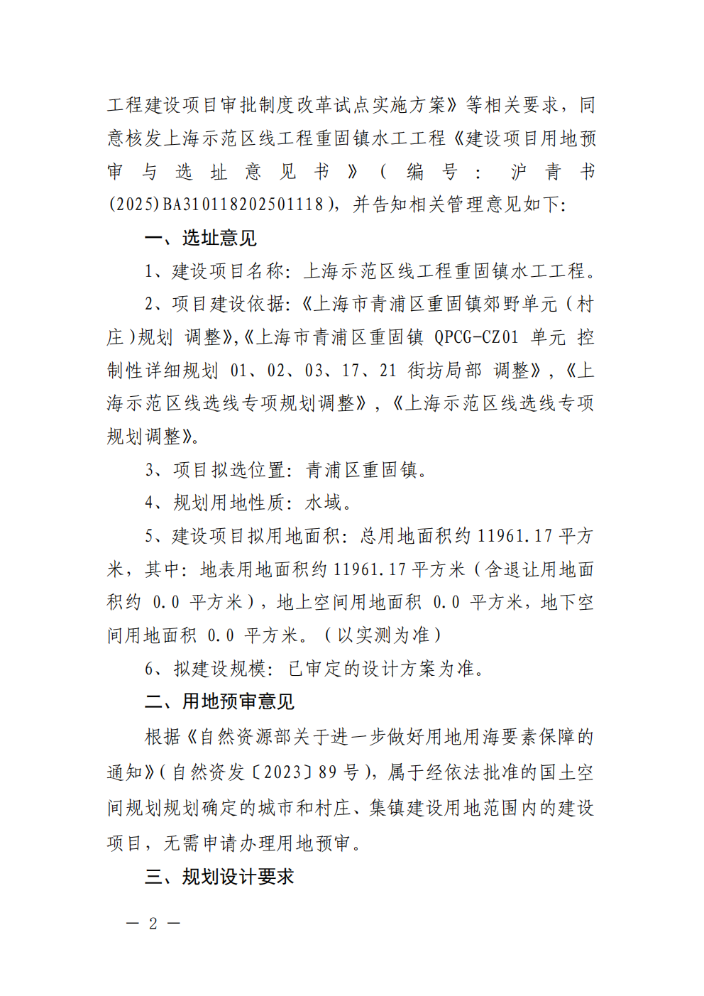 沪青书(2025)BA310118202501118建设项目用地预审与选址意见书(中交新凤溪(上海市青浦区重固镇人民政府)