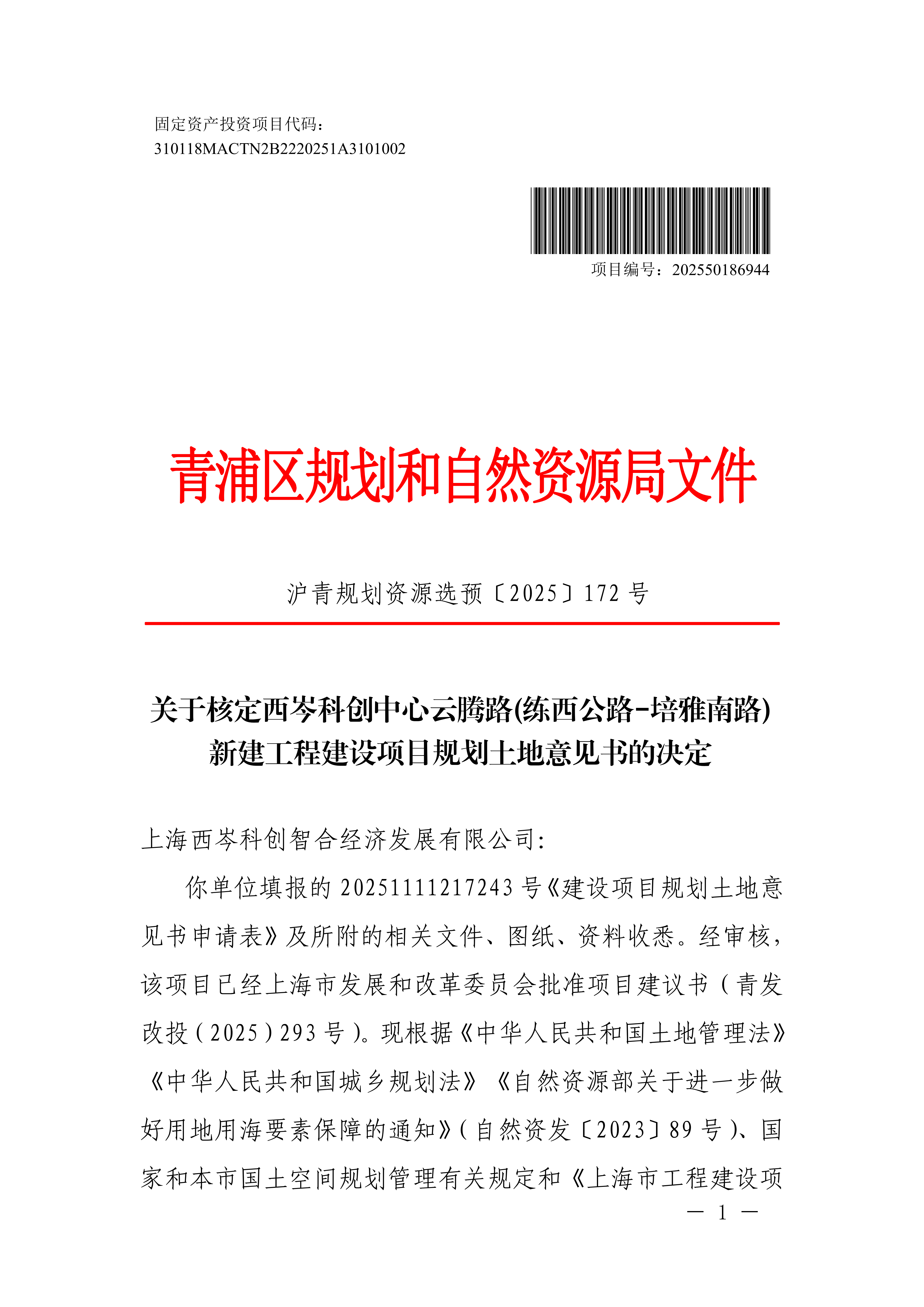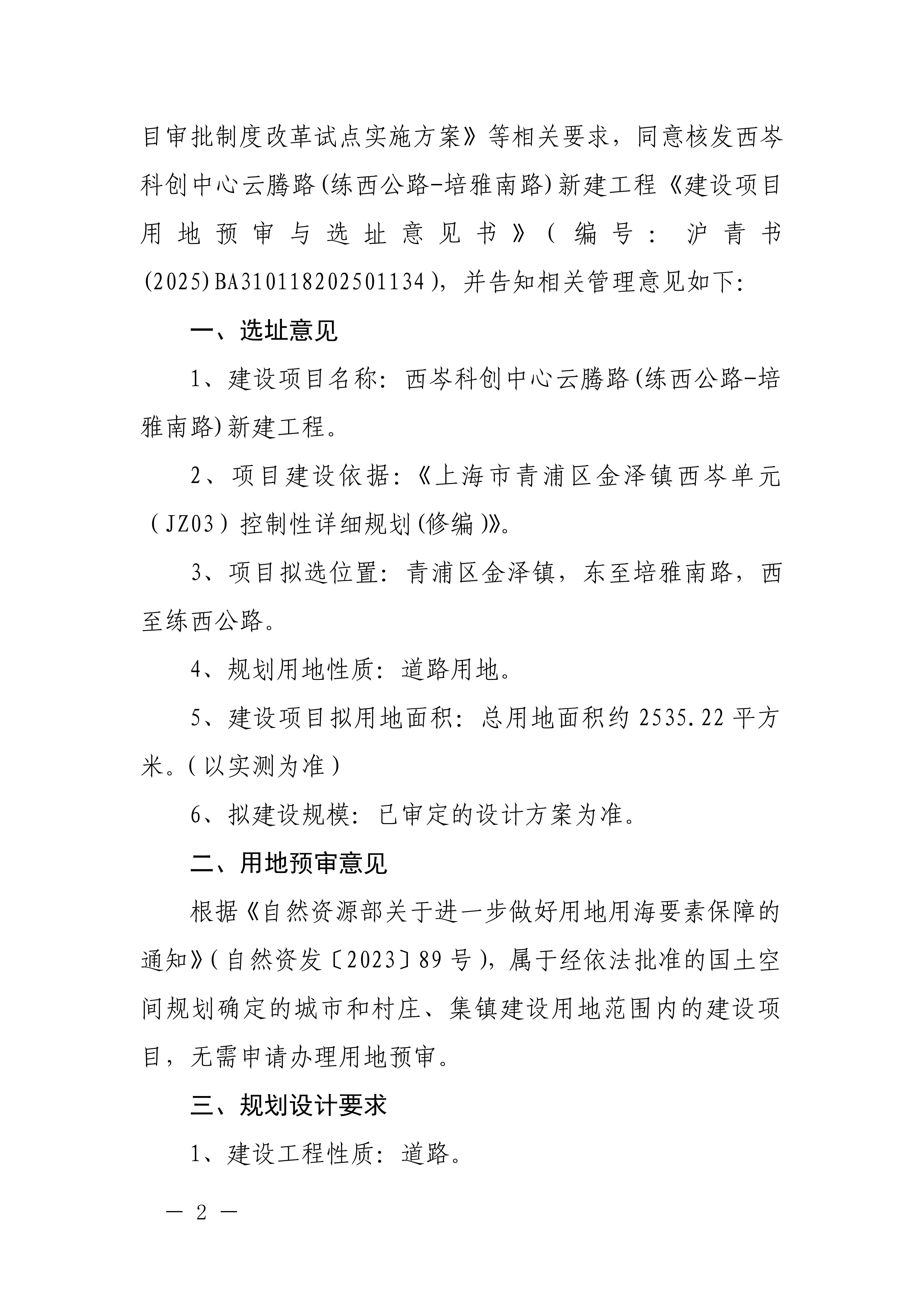 沪青书(2025)BA310118202501134建设项目用地预审与选址意见书(上海西岑科创智合经济发展有限公司)