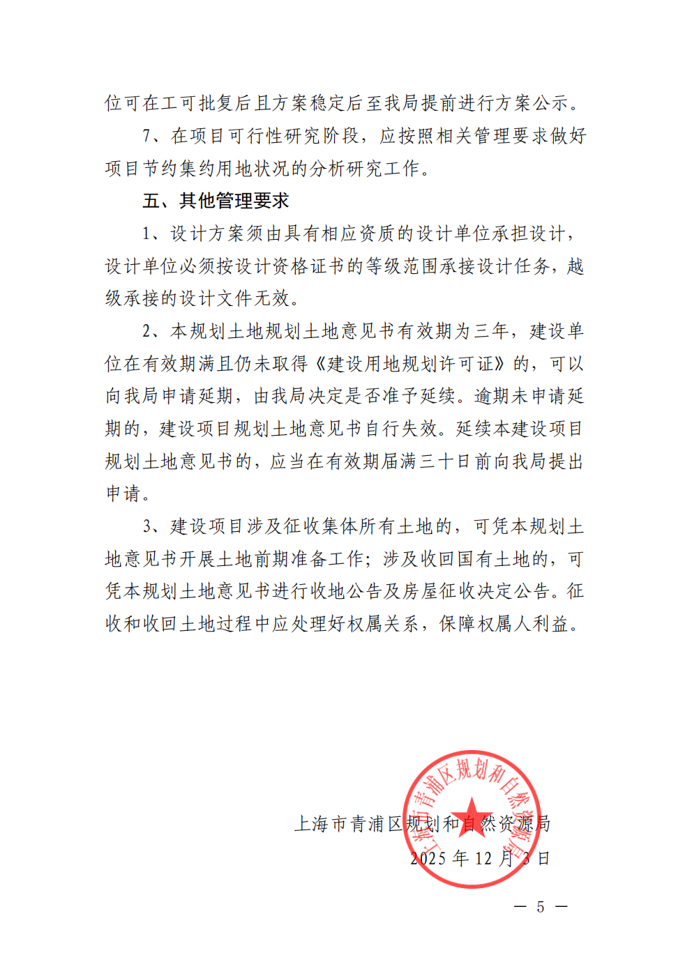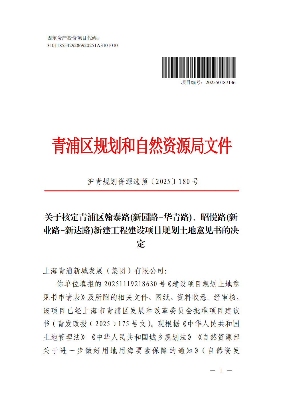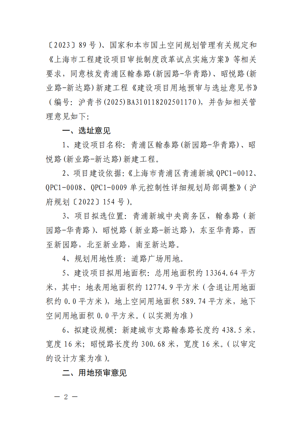 沪青书(2025)BA310118202501170建设项目用地预审与选址意见书(上海青浦新城发展(集团)有限公司)