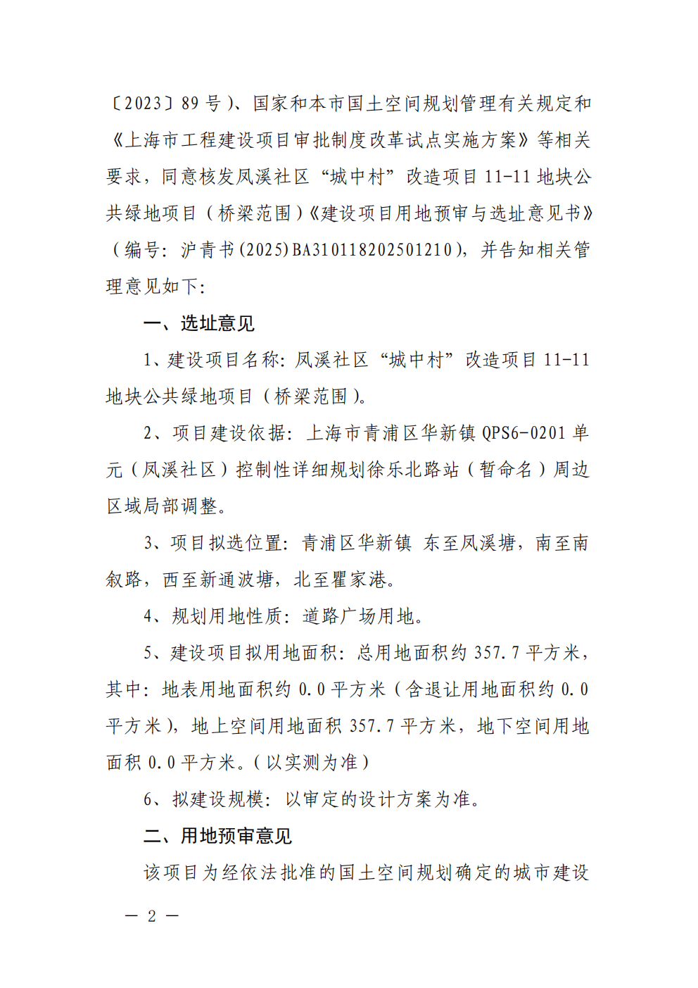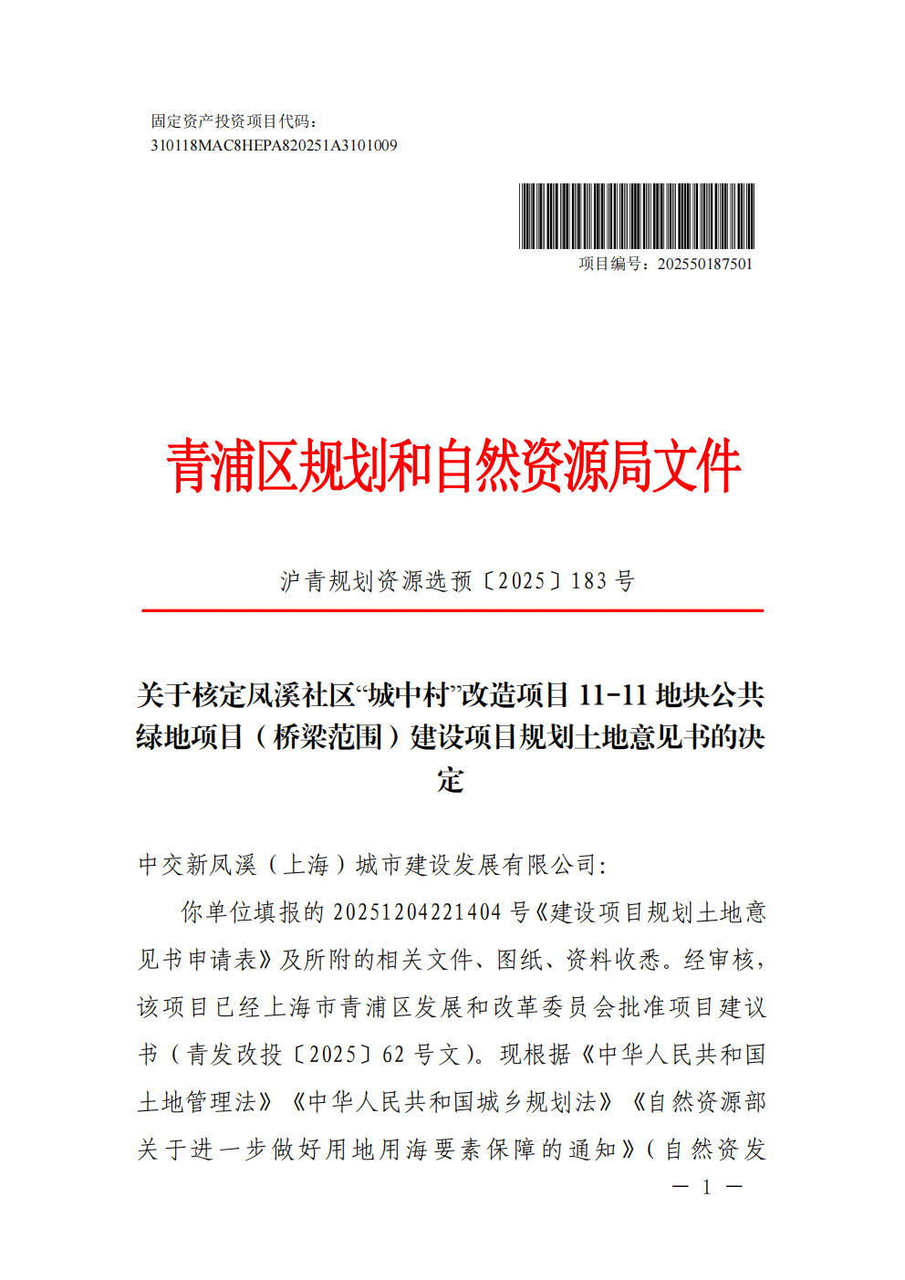 沪青书(2025)BA310118202501210建设项目用地预审与选址意见书(中交新凤溪(上海)城市建设发展有限公司)