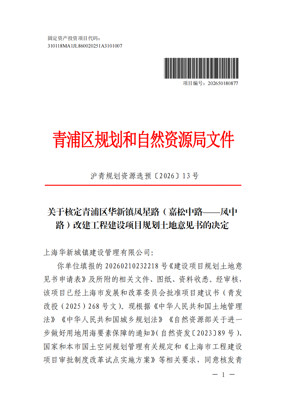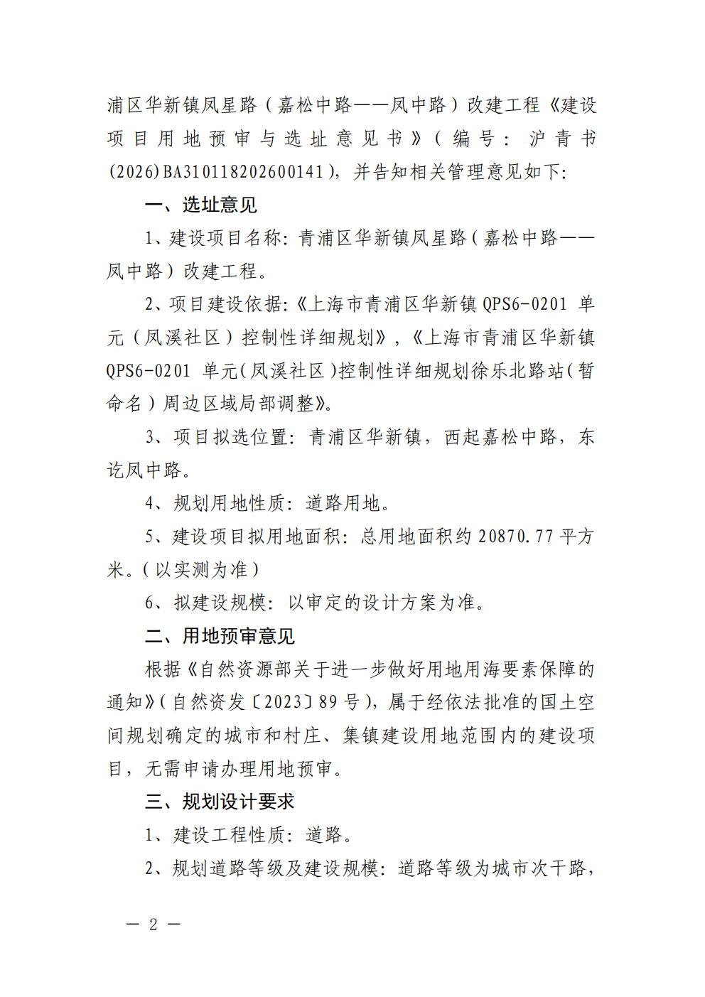 沪青书(2026)BA310118202600141建设项目用地预审与选址意见书(青浦区华新镇凤星路(嘉松中路——凤中路)改建 工程)