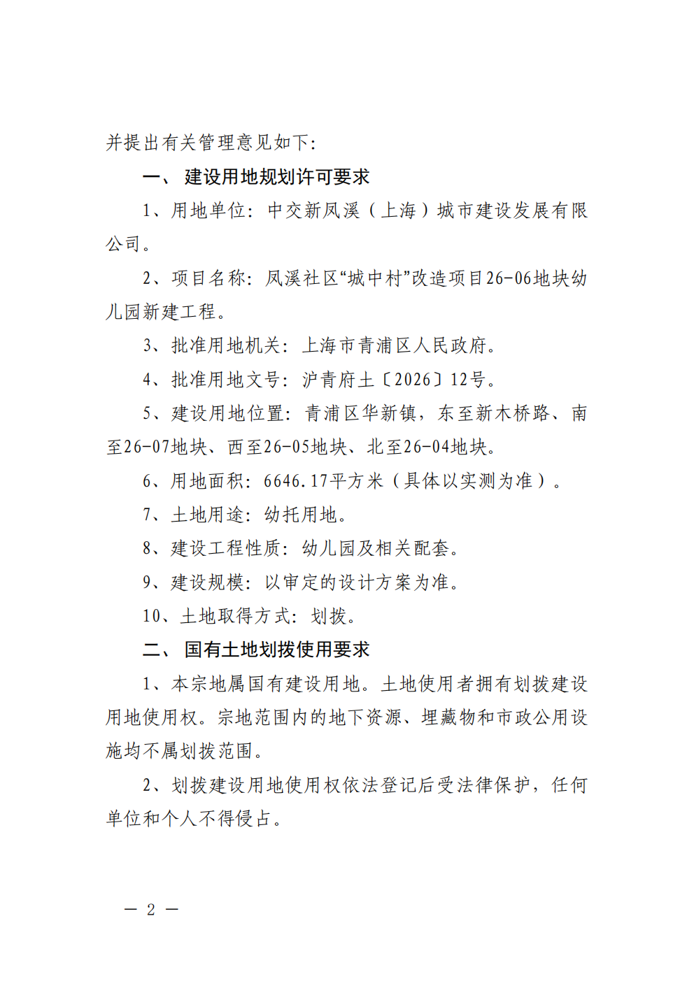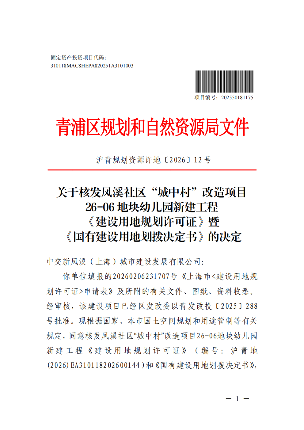 沪青地(2026)EA310118202600144建设用地规划许可公告(中交新凤溪(上海)城市建设发展有限公司)