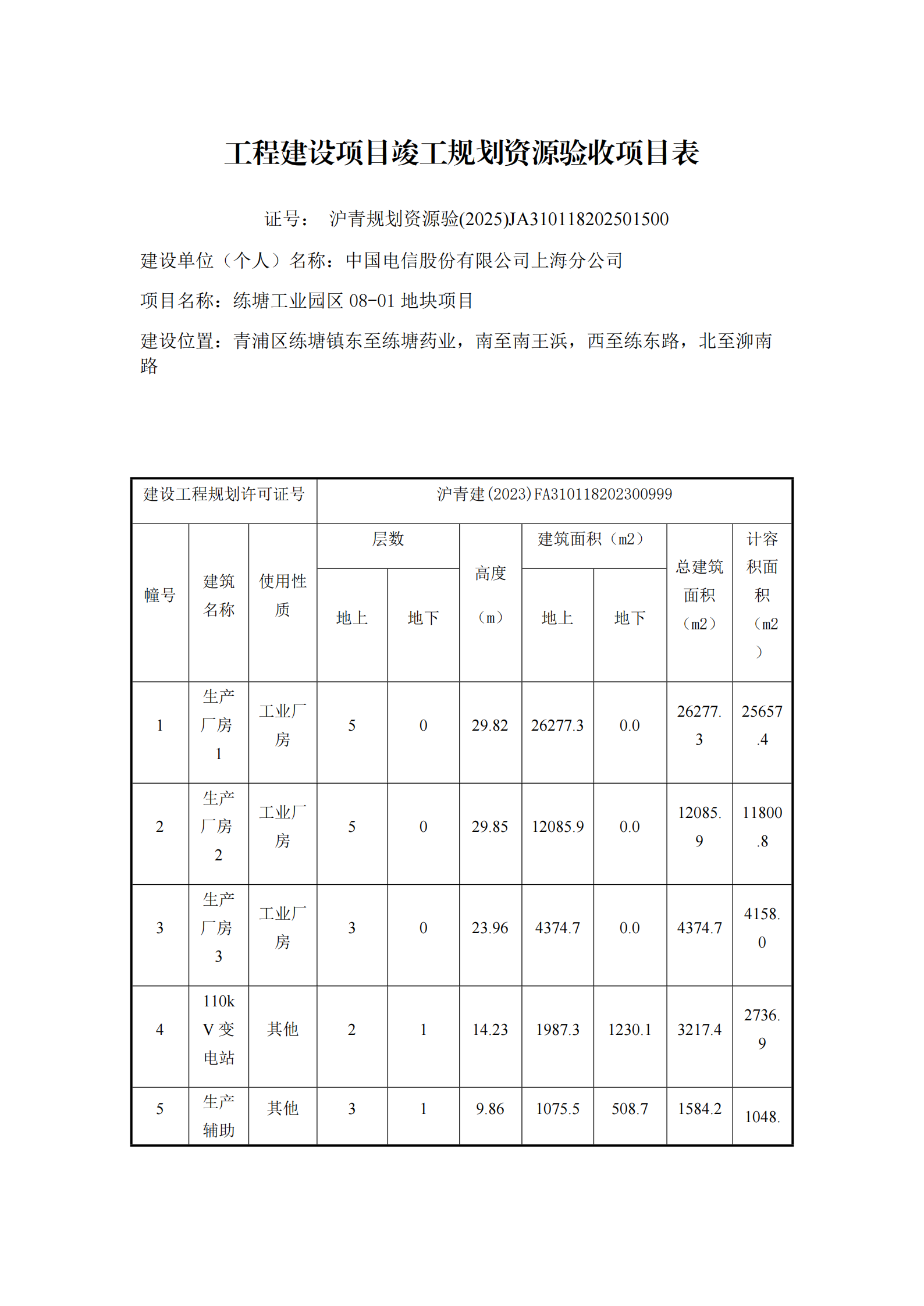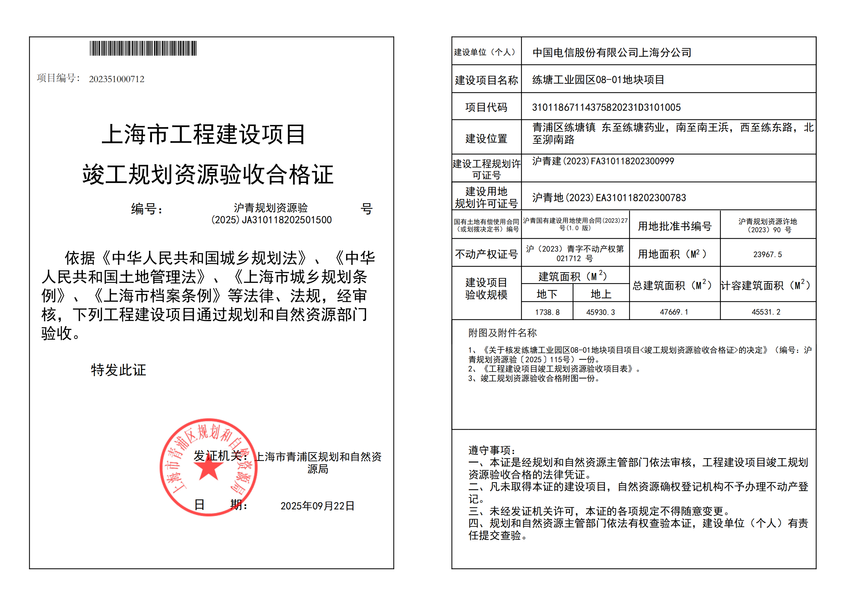 沪青规划资源验 (2025)JA310118202501500上海市工程建设项目竣工规划资源验收合格证(中国电信股份有限公司上海分公司)