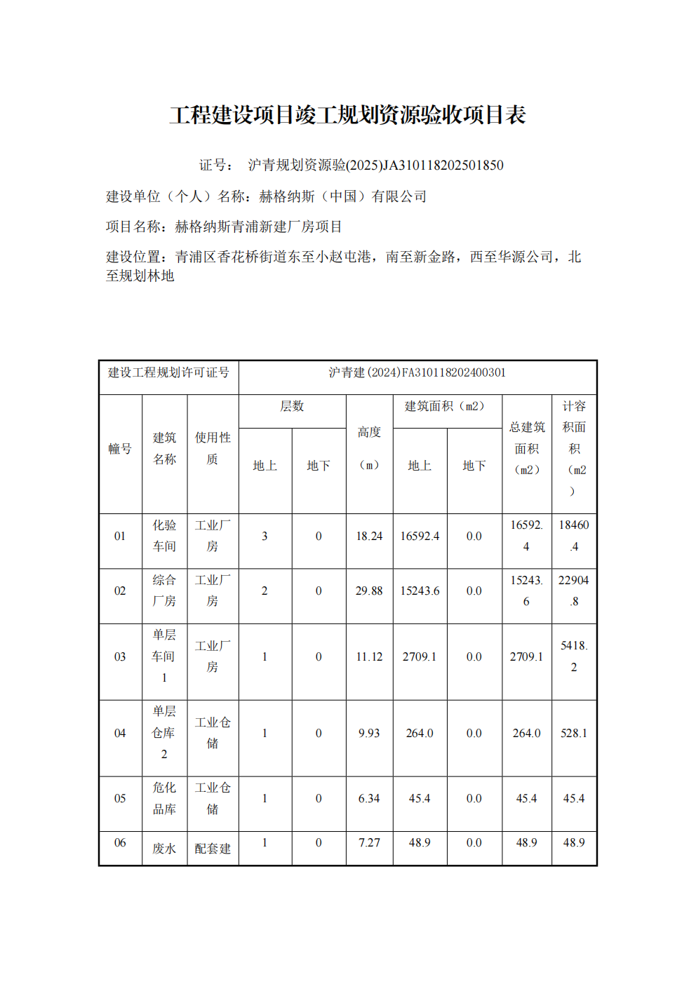 沪青规划资源验(2025)JA310118202501850上海市工程建设项目竣工规划资源验收合格证(赫格纳斯(中国)有限公司)