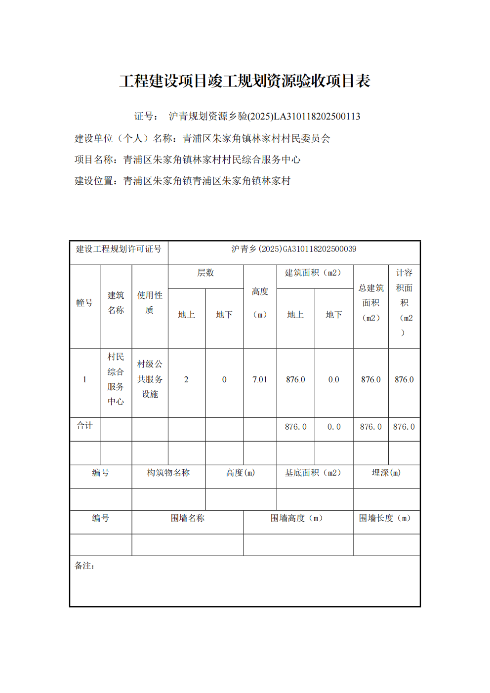 沪青规划资源乡验 (2025)LA310118202500113上海市工程建设项目竣工规划资源验收合格证(青浦区朱家角镇林家村村民委员会)