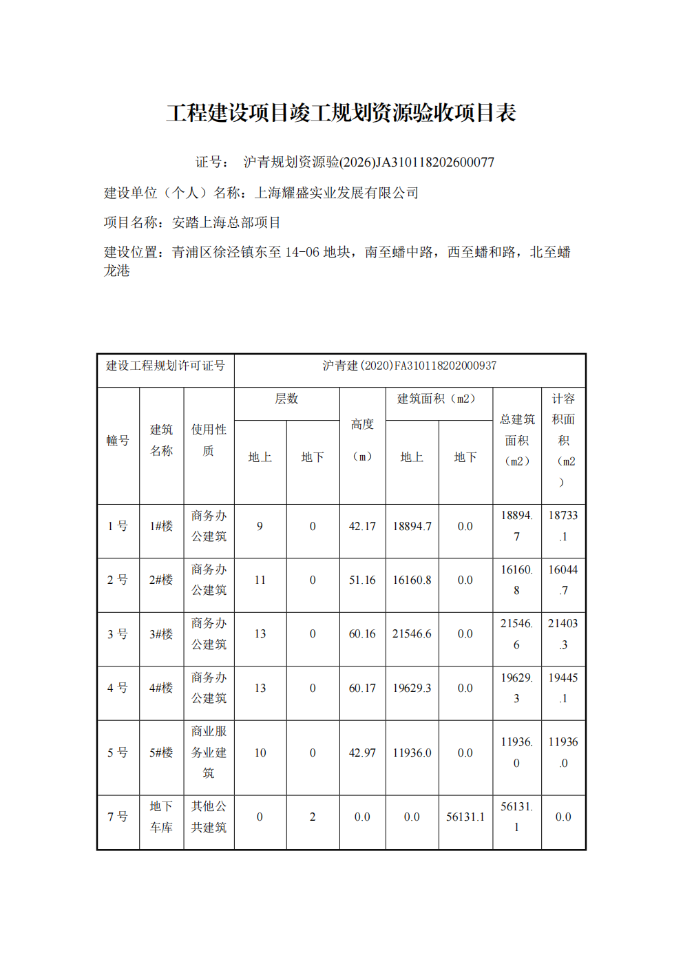 沪青规划资源验 (2026)JA310118202600077上海市工程建设项目竣工规划资源验收合格证(上海耀盛实业发展有限公司)