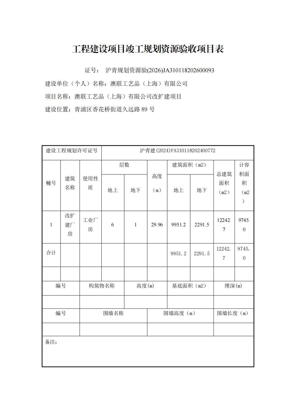沪青规划资源验 (2026)JA310118202600093上海市工程建设项目竣工规划资源验收合格证(澳联工艺品(上海)有限公司)