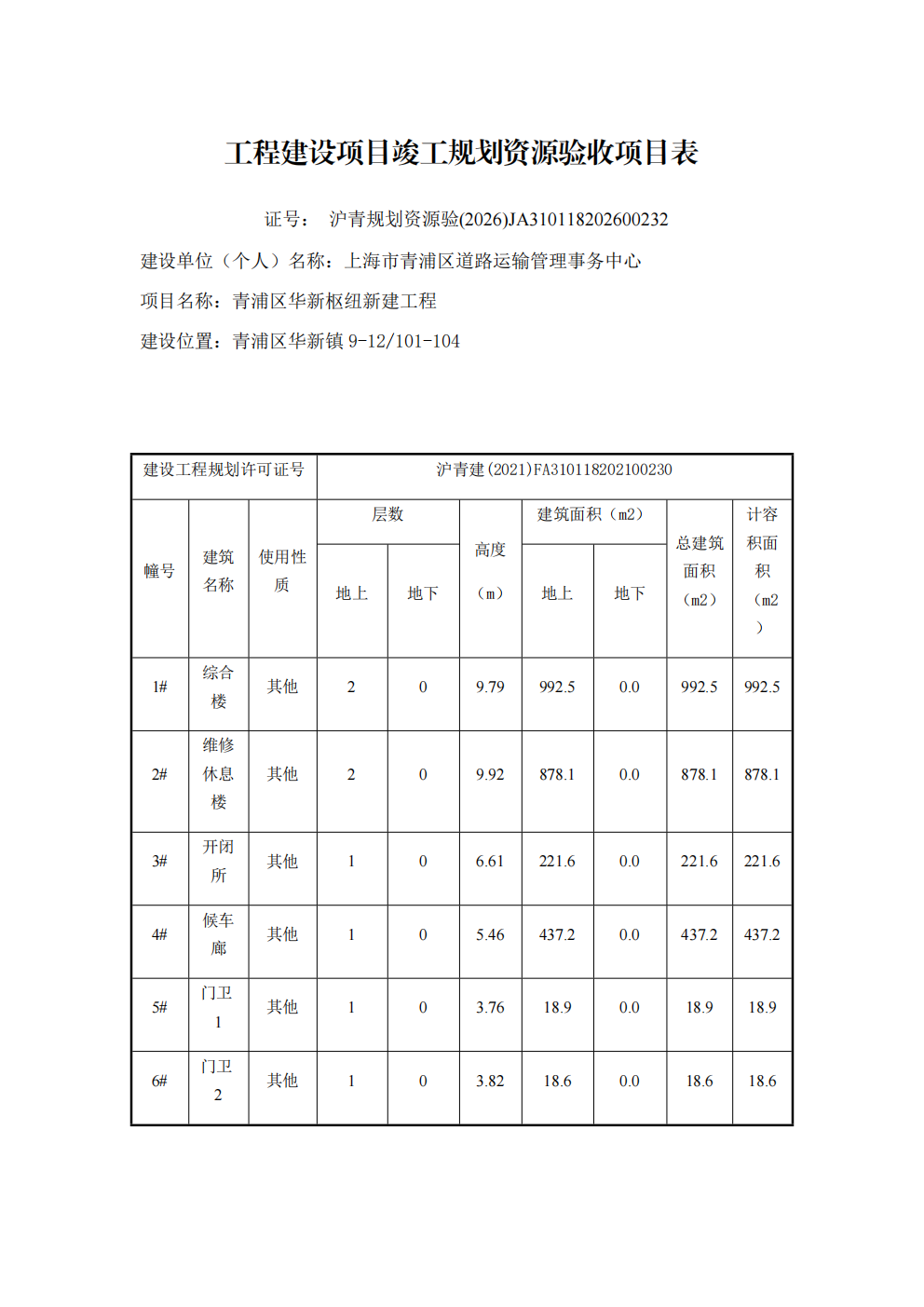 沪青规划资源验 (2026)JA310118202600232上海市工程建设项目竣工规划资源验收合格证(上海市青浦区道路运输管理事务中心)