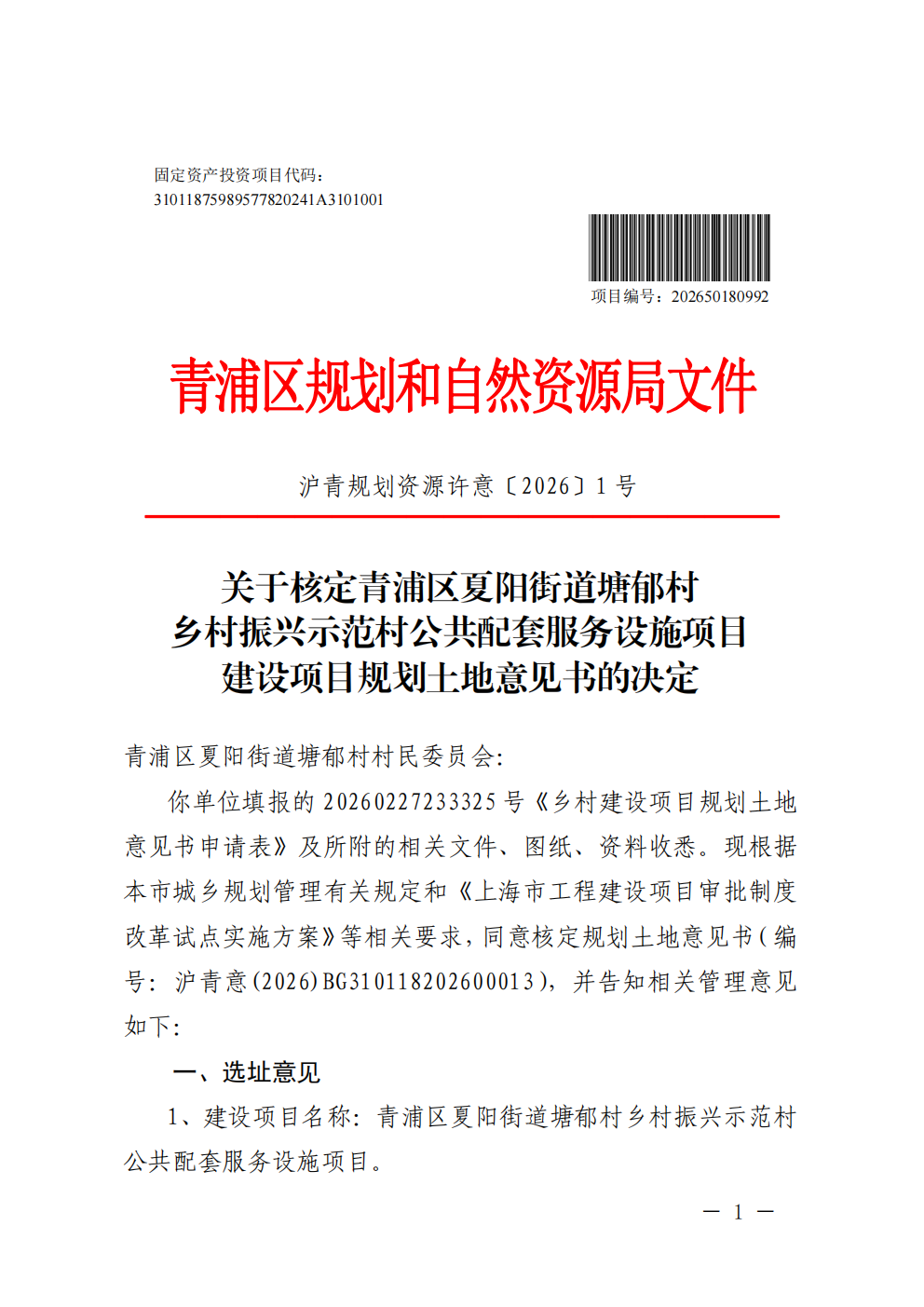 沪青意(2026)BG310118202600013建设项目规划土地意见书公示