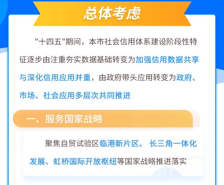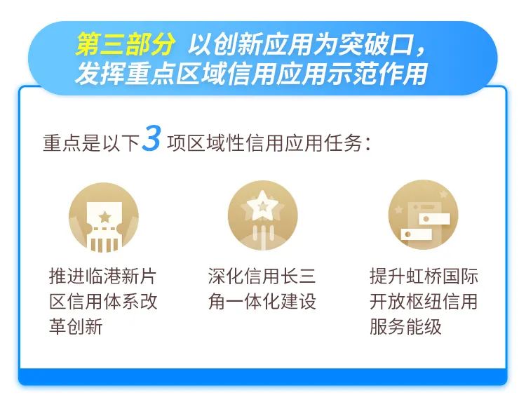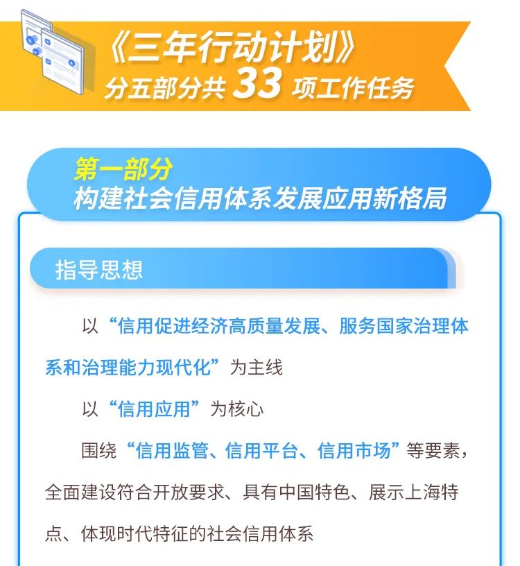 《三年行动计划》以服务国家战略、突出信用应用、坚持目标导向为总体考虑,提出了五部分共33项工作任务,包括全方位优化公共信用平台数字化支撑体系、推进临港新片区信用体系改革创新、强化信用助力科技创新策源功能等。详↓