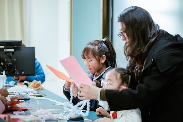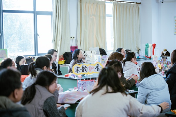 课后延伸的纺织主题实践体验活动,成为本次教研的一大亮点。瀚文片科学教师团队精心设计的十八个特色体验展台,涵盖传统技艺传承与现代创意实践两大维度,构建了兼具科学性、趣味性与文化性的实践探究场景。“宋韵织香・发夹铺”“丝韵成扇・匠心缫丝坊”等展台,聚焦传统纺织工艺,让学生在宋锦装饰制作、缫丝制扇的过程中,感受中华优秀传统文化的魅力;“DIY织布机”“暖冬绒线・圣诞织趣” 等展台,侧重实践创新,学生通过组装织布模型、编织节日饰品,深化对材料特性与工艺逻辑的理解;“古法纺线”“手指编织”“夏达拉”等特色项目,则丰富了学生的实践体验维度,让学生在多元探究中感知纺织工艺的多样性与实用性。活动中,学生通过自主选择、合作探究、实践创作,不仅巩固了课堂所学的科学知识,更在实践中提升了动手能力、合作意识与文化认同,实现了科学素养与人文素养的协同发展。每一位教师在耐心细致地对孩子们进行辅导的同时,也充分感受同伴们布置的巧心思,辅导之余、教师们也同样化身小学徒,提高各项纺织的技艺。
