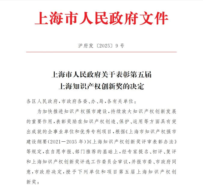 喜报!青浦区两家企业荣获第五届上海知识产权创新奖 2025-10-22 来源:“绿色青浦”微信公众号