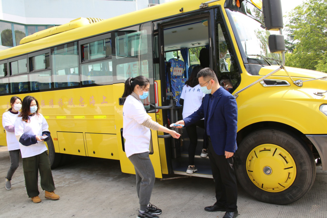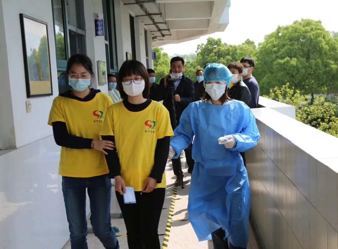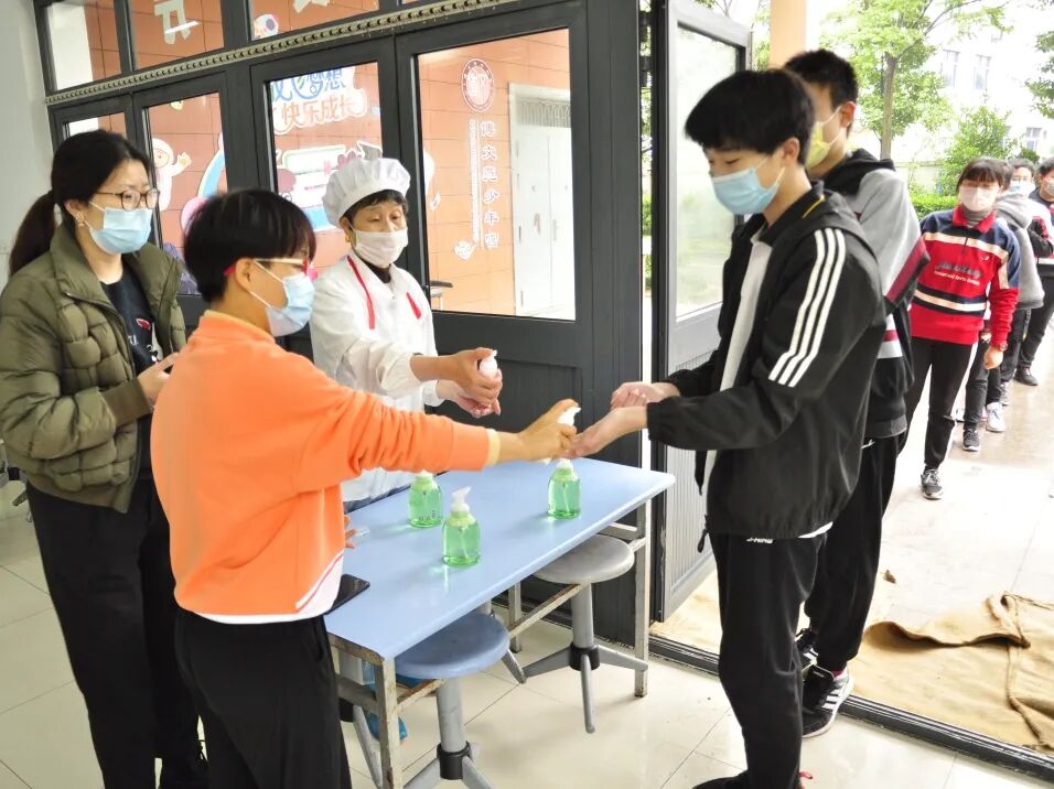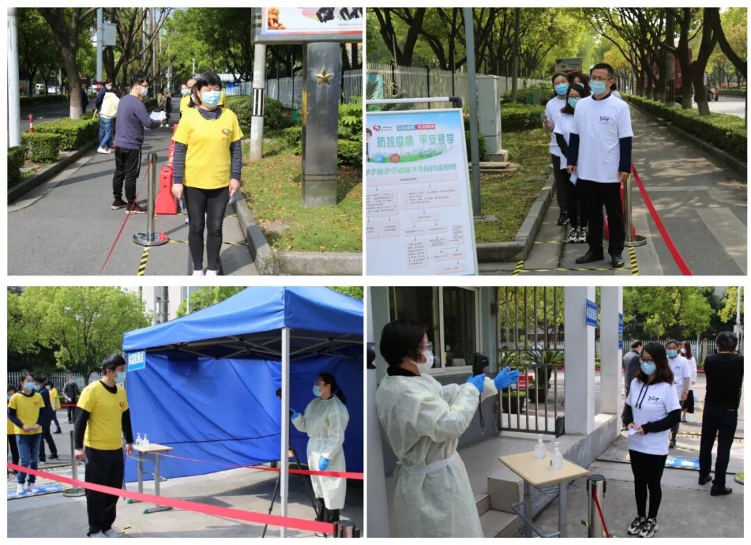 崧泽学校在校门口设置了东、西两个入校的渠道,并设置了测温点,值日老师和校医负责为入校学生测温,五年级和九年级的学生在老师的引导下,之间保持一米的距离有序经过测温后进入校园。 而在博文学校,参与演练的学生按照学校《疫情防控工作预案》中规定的各班级入校次序,在规定通道,间隔一米以上距离有序排队,依次测量体温、涂抹免洗洗手液。体温正常的学生按照指定通道进入教室。 崧泽学校,两个班级的学生沿预定路线有序前往班级,正、副班主任等候在班级门口,一位负责提供免洗手消毒液,一位负责量体温,学生坐定,填写健康卡。 上课途中有学生突感不适,举手汇报授课老师,授课老师电话联系校医和班主任,校医为不适学生测体温显示有发烧症状,及时带领学生前往留观点进行隔离。授课老师带领其余学生到操场,工作人员对教室进行消杀。 博文学校的教室里,课桌间距被拉开,严格实行一人一桌。学生进入教室后,班主任再次进行检查,主要观察学生是否有发热、咳嗽、乏力等不适情况,详细询问学生近期是否与重点地区或国家返沪人员有来往、家庭成员身体状况如何等情况。 午间,班主任对学生进行第二次体温测量,发现一同学精神萎靡,并伴有咳嗽等疑似症状,体温为37.6℃。班主任立即上报学校疫情防控领导小组,迅速启动应急处置流程,将该学生带到隔离室,其他学生则转移至备用教室上课。学校消毒防疫组马上对该教室进行全面消毒。 崧泽学校的值日老师监督学生餐前洗手,学生有序排队,间隔一米。学生就餐时按规定同向就坐,就餐前解口罩,就餐后带好口罩,有序排队离开。 而博文学校的食堂中,也上演着同样的情景。 崧泽学校的班主任带领学生排队出校门,前后间隔一米。 博文学校实行错峰放学。各班按照规定时间排队离开教室,班级间距为10米,学生之间间隔不少于1米,由班主任带队,将学生有序送至指定接送地点。 崧泽学校还安排有校车,学生间隔一米排队测体温上车,车上学生间隔就坐,随车老师讲解防控知识、乘车须知,示范应急逃生措施。 开学在即,小青果也希望这些模拟演练能让大家吃下一颗定心丸!