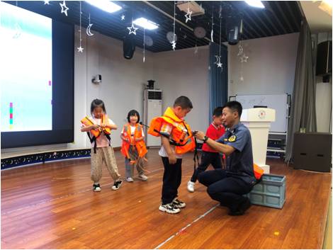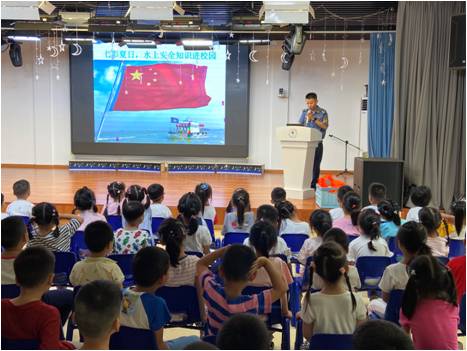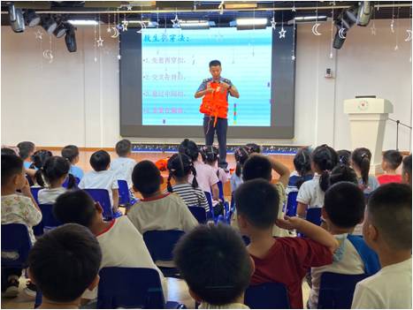 当天上午,执法人员为该园中班年级组140余名师生们上了一堂以“七彩夏日,水上安全知识进校园”为主题的水上交通安全知识教育课。执法人员通过多媒体演示、动画短片、互动问答、模拟演练等趣味性强的教学方式,并以贴近生活的例子向小朋友们介绍了常见船舶种类、乘船注意事项、安全标志识别、水上急救措施、防溺水知识等水上安全常识。在互动环节,执法队员在师生们面前演示了不同救生衣的正确穿戴方式和技巧及注意事项,台下小朋友们认真看完执法人员演示后,积极大胆地走到台前进行体验。执法人员耐心地教导小朋友们熟练使用落水救生设备,同时提醒他们,在遇到其他人溺水时,一定不能以身涉险,要在确保自己安全的情况下进行救助。最后,执法人员和小朋友们一起大声朗诵水上救援电话12395“要岸上救我”,加深记忆。