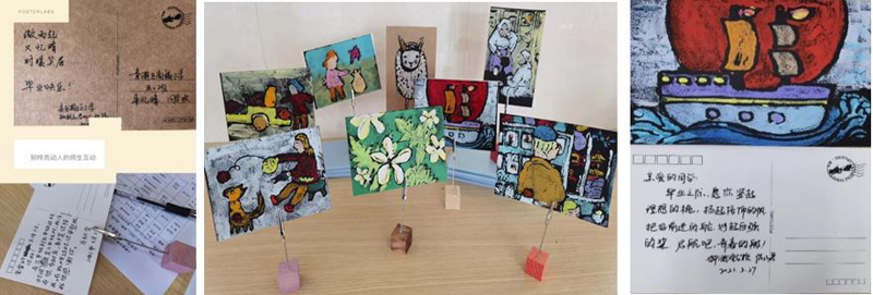 课后,学生还意犹未尽,沉浸在吹塑版画的快乐创作之中。种子团队的老师们被眼里有光,心中有爱的学生所感动。在张老师的示范引领下,每位老师也动手创作一张精美明信片,并写上对商榻学生的美好祝福。让主题活动得到进一步升华,让优质资源很好的辐射到偏远乡镇学校,让学生多了一种美的体验和感悟。