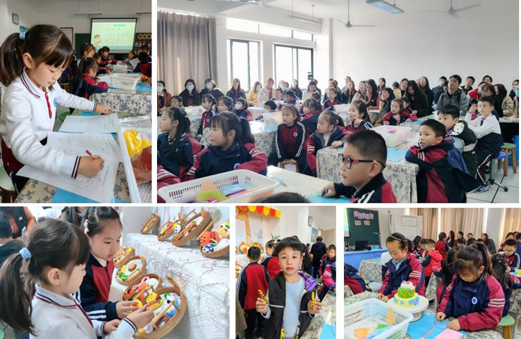 文旭芳老师执教上教版小学美术第一册第四单元第2课《小小快餐店》;陈芳捷老师执教本单元第3课《美丽的蛋糕》。在青浦区教师进修学院美术教研员张梅凤老师的组织下,50多位小学美术教师一起观摩两节课教学。课堂上,一年级小朋友积极投入、热情互动,在老师们的指导下,制作出造型多样又逼真的快餐和喜庆蛋糕,全班学生如愿打造了私人订制的美食店,让与会教师感叹不已。