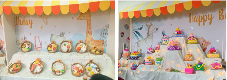 最后,教研员张老师对本次活动做了总结。首先,对学校领导的大力支持和校本美术团队的通力协作,表示感谢!也对两位青年教师能精益求精的开展课例研究给予充分的肯定。具体表现在以下三个方面:其一,大单元作业设计的精细化处理。两位老师从工具、材料、媒介上、造型的创意启迪上都做了精心的部署;其二,教学教法上的深入思考。用学生易懂的顺口溜加强对不同造型快餐基本型的认知;巧用地域资源——元祖梦工厂,激发学生对美丽蛋糕创意表现的热情。其三,注重良好学习环境的营造。课桌有了美丽的桌布,让学生恍如置身于快餐店;习作展台以美食店的实景呈现,让学生加倍的投入到创意表现活动中,希望快速拥有班级的美食店,审美愉悦润泽童心。