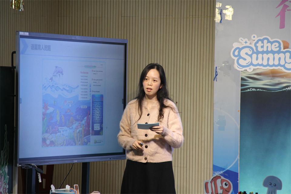 实验小学陆文蕾老师、青教院附小朱英蕾老师分别就第一、第二课时进行说课,从语篇解读、情感渗透、活动设计等方面阐释如何通过体验与实践深化学生对海洋动物的认知与情感。