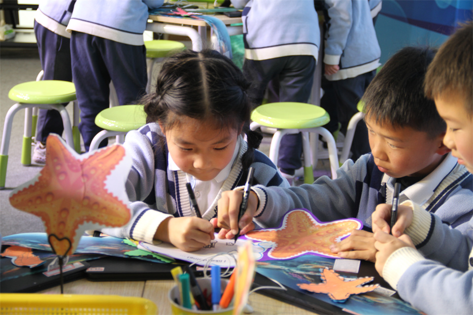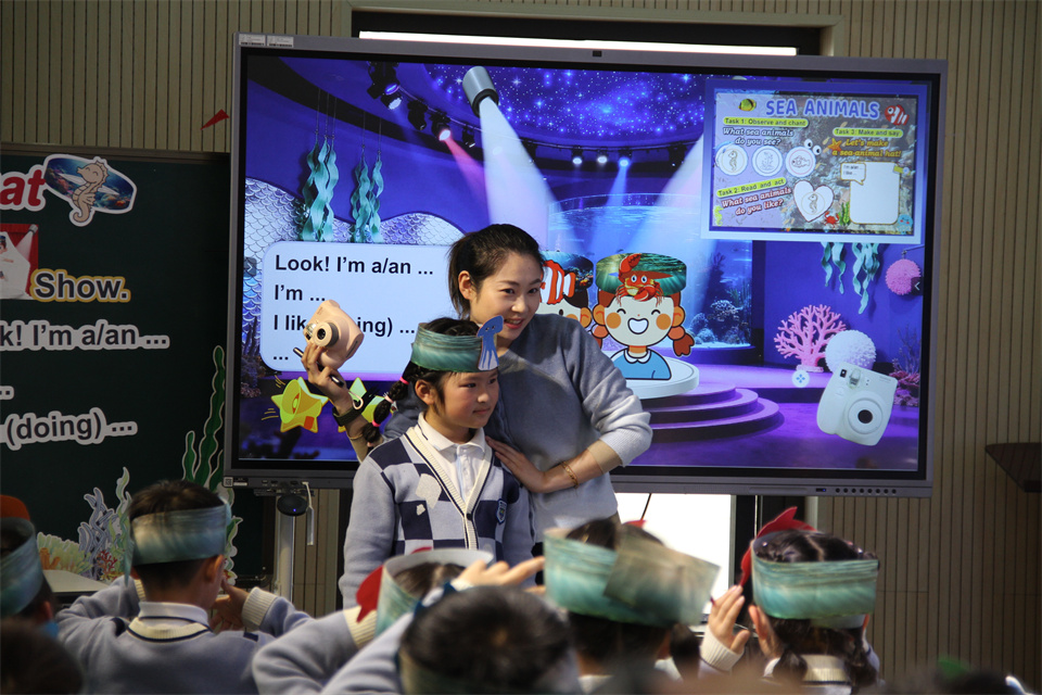 随后,青教院附小王茜圆老师执教第三课时 My sea-animal hat。王老师的课堂生动活泼,师生互动充分,教学环节流畅自然。王老师进行课前调查,为学生制作个性化学习资源,引导学生通过自主探究、制作头饰、小组讨论、角色扮演等方式,运用语言介绍海洋动物的特征与习性,在微项目的学习与实践中实现语言运用与情感升华。