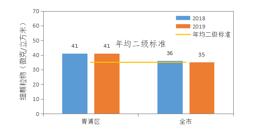 2019年,青浦区PM2.5年均浓度为41微克/立方米,超出国家环境空气质量二级标准6微克/立方米,与2018年(41微克/立方米)持平。