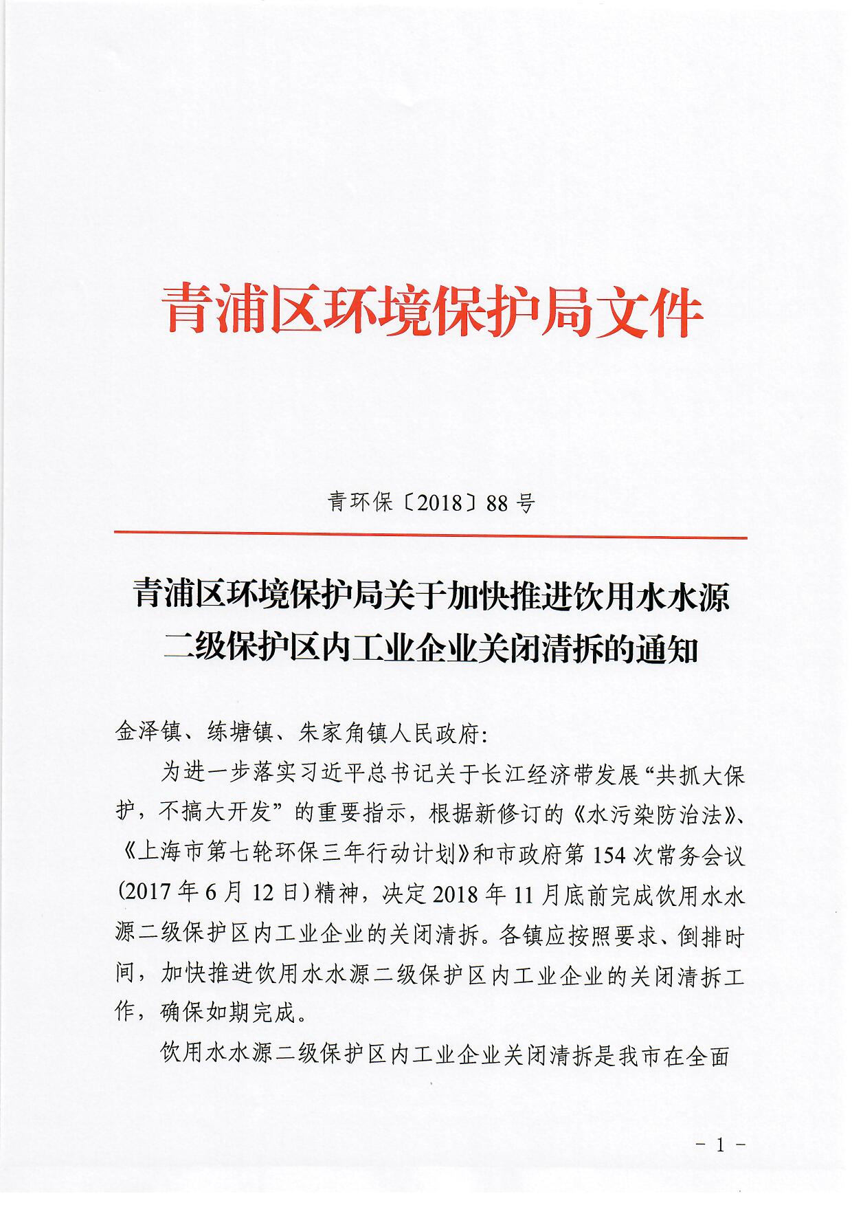(88)青浦区环境保护局关于加快推进饮用水水源二级保护区内工业企业关闭清拆的通知