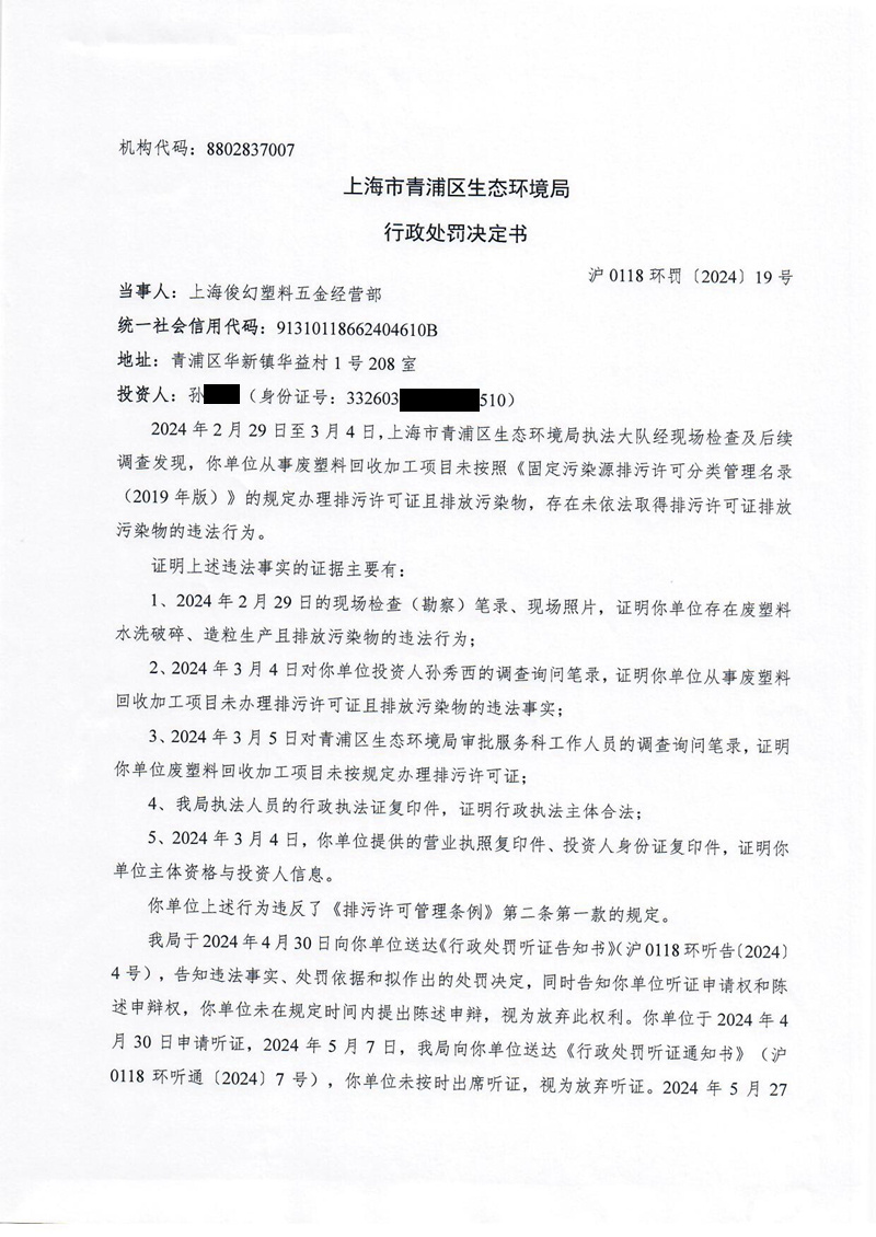 沪0118环罚〔2024〕19号 上海俊幻塑料五金经营部