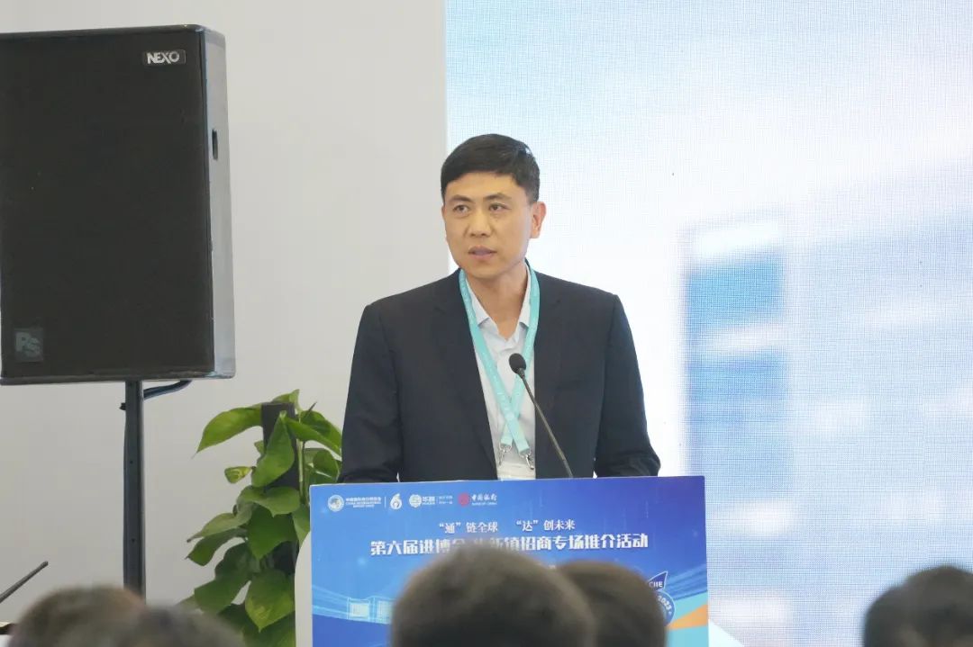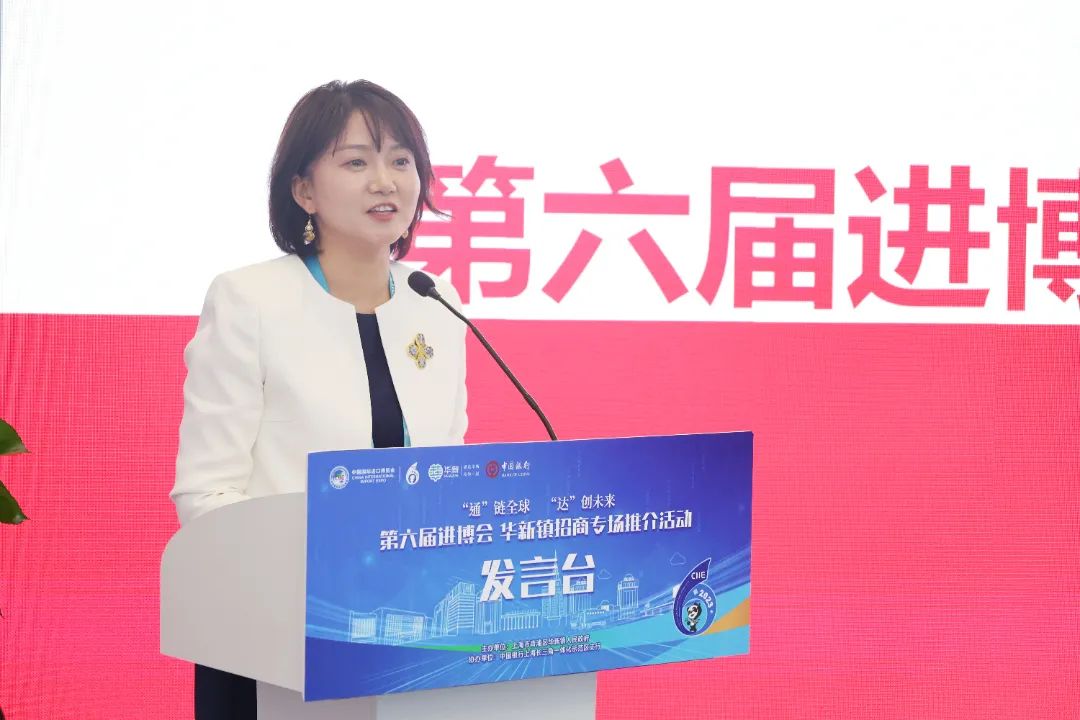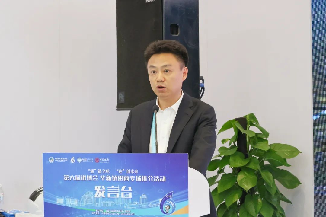 镇党委副书记、镇长许伟明向到场来宾致辞。他指出,近年来,随着上海商贸型国家物流枢纽、虹桥数字物流装备港等一系列重大项目的落地,已逐步凸显华新的发展潜力。华新将始终围绕“枢纽核、虹桥里、幸福城”的总体发展定位,借着进博会的窗口和支点作用,带着大虹桥区域一流的产业空间和扶持政策继续蓬勃发展,也衷心希望各位企业家朋友能够选择华新、投资华新、扎根华新,与华新一起双向奔赴、通达未来、成就精彩。