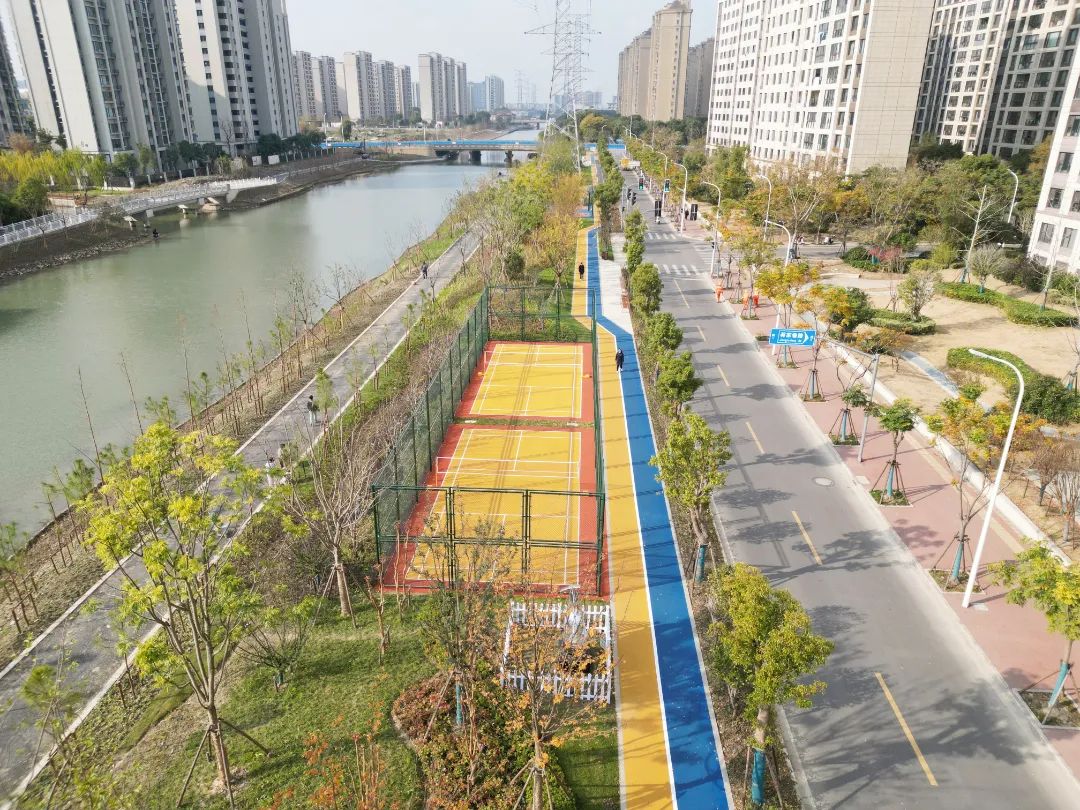 滨河景观绿带不仅关注景观效果,更重视其实用性和对周边环境的提升作用,在项目建设中充分考虑市民的活动需求和休闲体验,增设了全线彩色塑胶跑道、篮球场、羽毛球场、休憩凉亭、休闲座椅、雕塑景观等配套设施,满足周边市民健身运动、游憩观景等多样化需求。