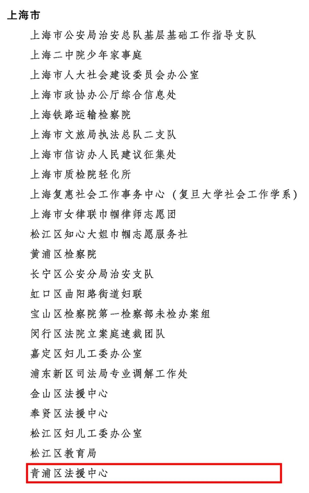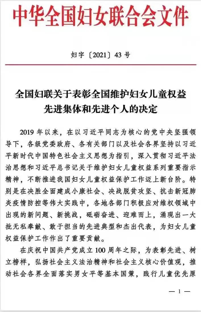 近日,全国妇联表彰了一批全国维护妇女儿童权益先进集体和全国维护妇女儿童权益先进个人。青浦区法律援助中心被评为全国维护妇女儿童权益先进集体。这是中心继2013年被评为全国五一巾帼标兵岗,2018年被评为上海市司法行政工作先进集体以来收获的又一殊荣。