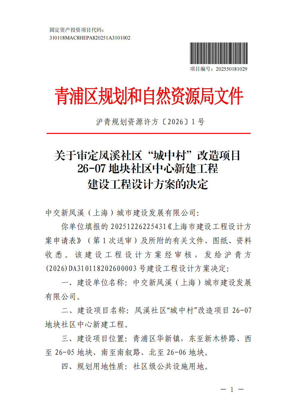 沪青方 (2026)DA310118202600003号建设工程设计方案(中交新凤溪(上海)城市建设发展有限公司)
