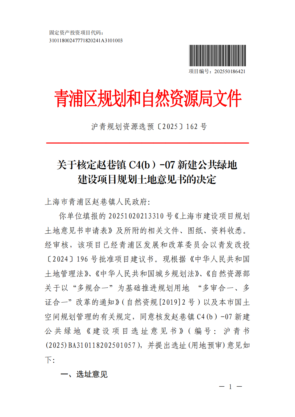 沪青书 (2025)BA310118202501057建设项目用地预审与选址意见书(上海市青浦区赵巷镇人民政府)
