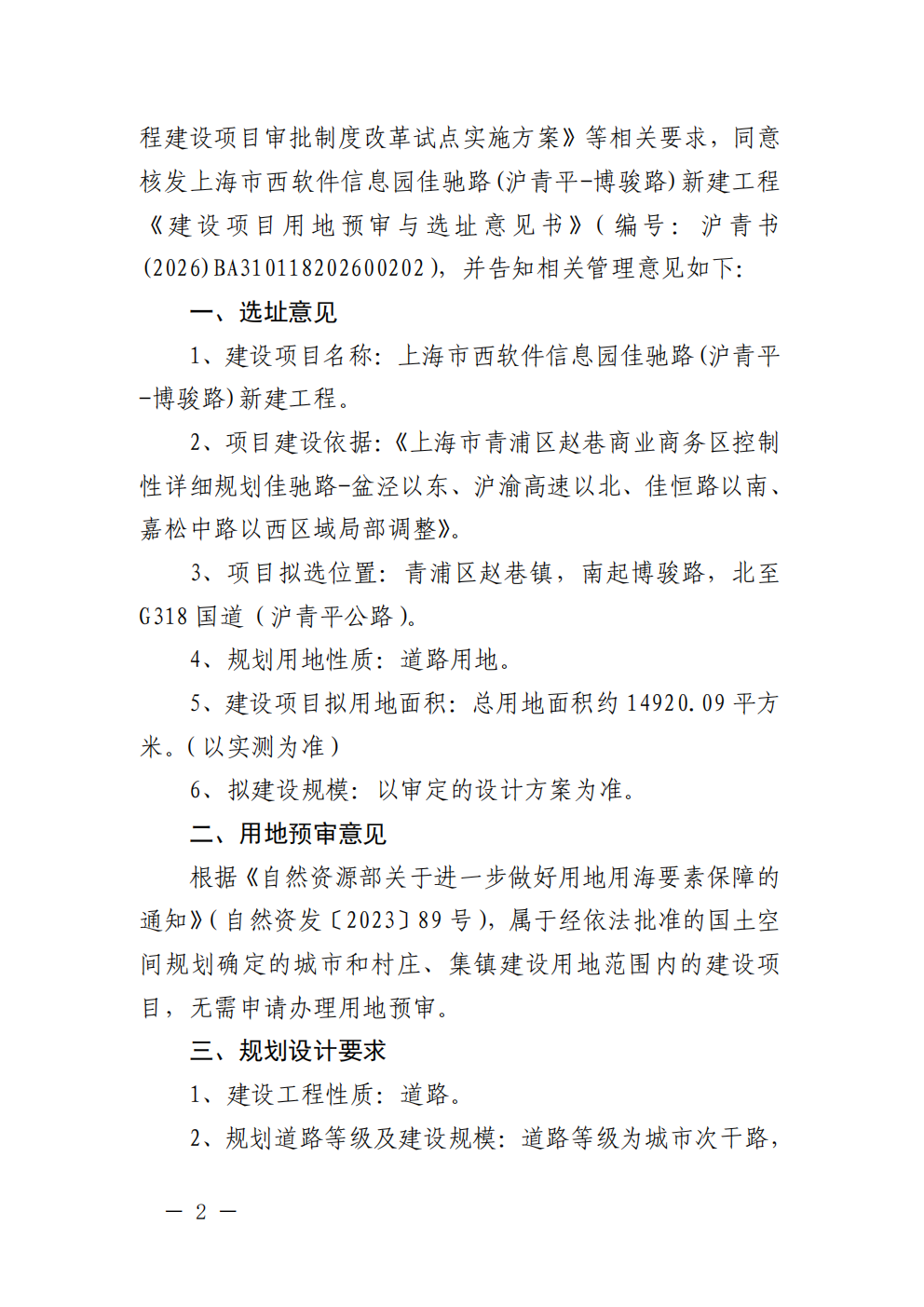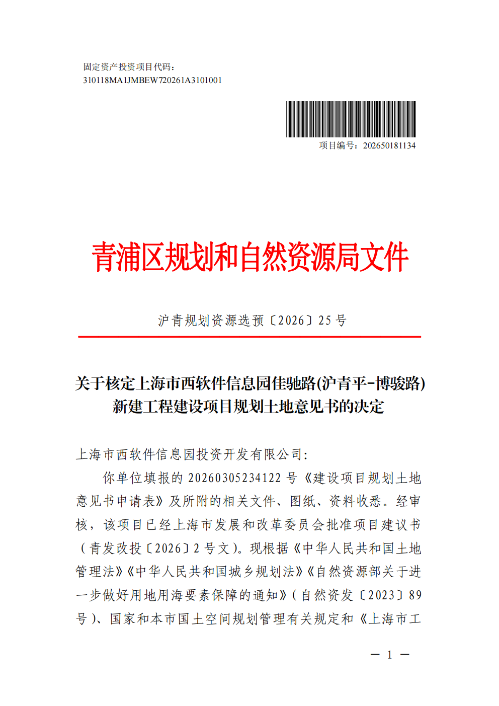 沪青书(2026)BA310118202600202建设项目用地预审与选址意见书(上海市西软件信息园投资开发有限公司)