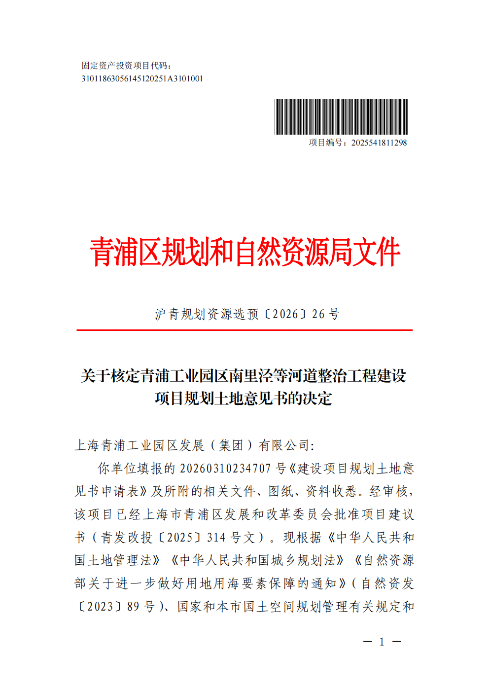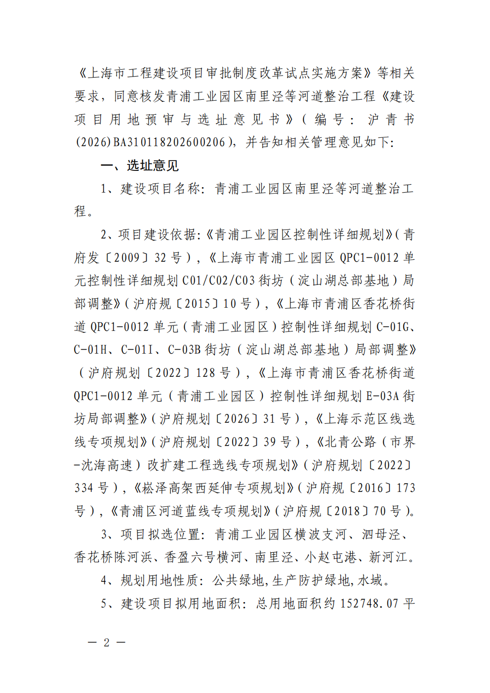 沪青书(2026)BA310118202600206建设项目用地预审与选址意见书(上海青浦工业园区发展(集团)有限公司)