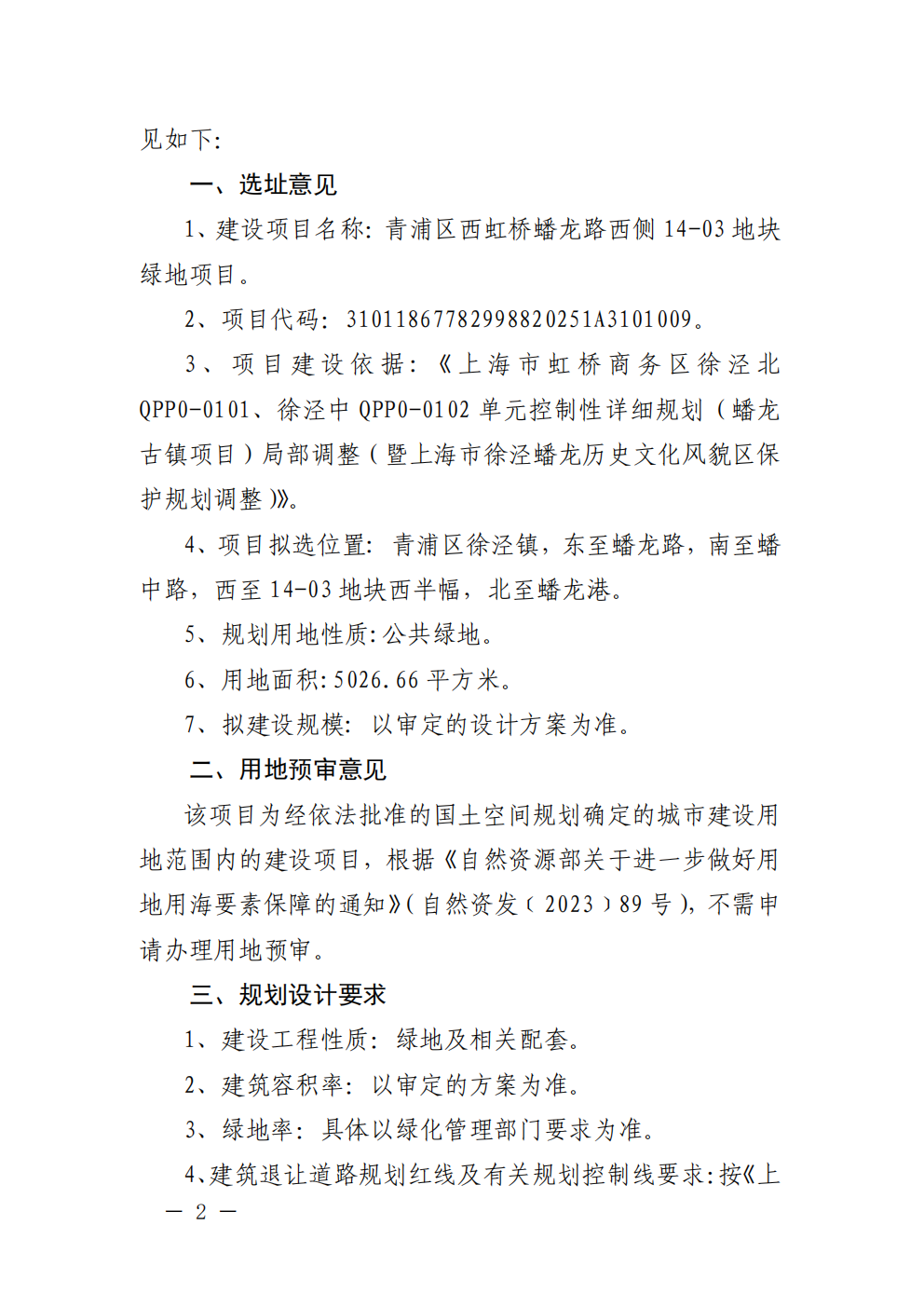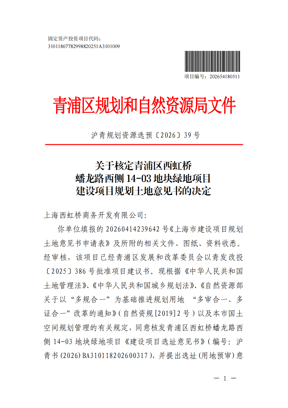 沪青书(2026)BA310118202600317建设项目用地预审与选址意见书(上海西虹桥商务开发有限公司)