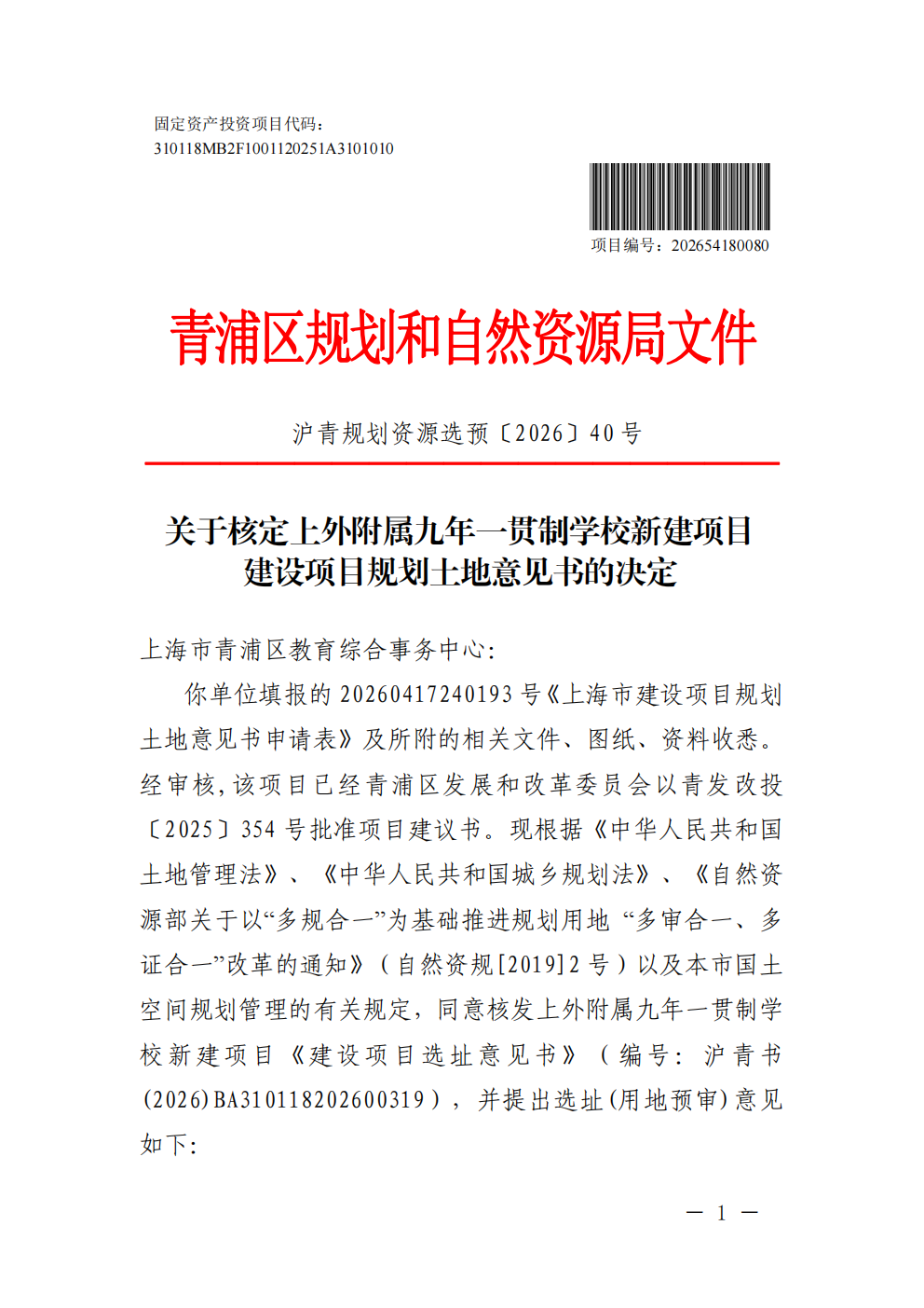 沪青书(2026))BA310118202600319建设项目用地预审与选址意见书(上海市青浦区教育综合事务中心)