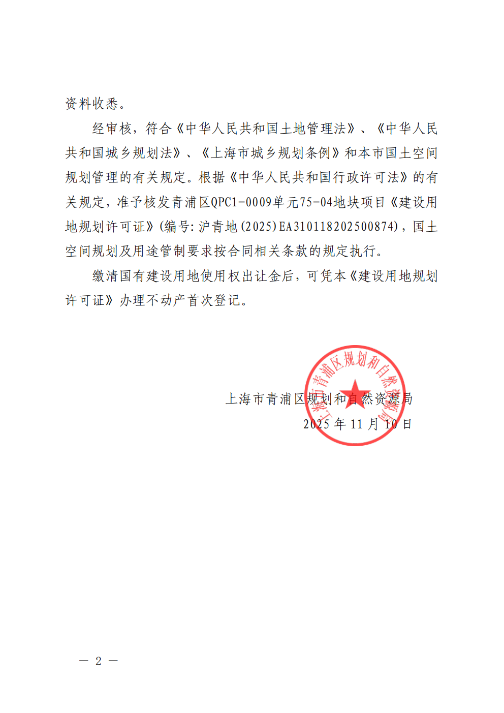 根据《中华人民共和国城乡规划法》、《上海市城乡规划条例》等有关规定,现对沪青地(2025)EA310118202500874建设用地规划许可证进行公开。