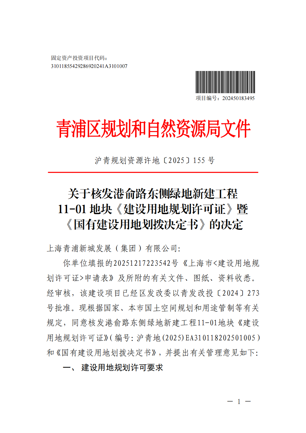 沪青地(2025)EA310118202501005建设用地规划许可公告(上海青浦新城发展(集团)有限公司)