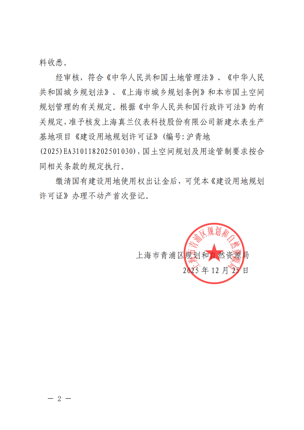 沪青地(2025)EA310118202501030建设用地规划许可公告(上海真兰仪表科技股份有限公司)