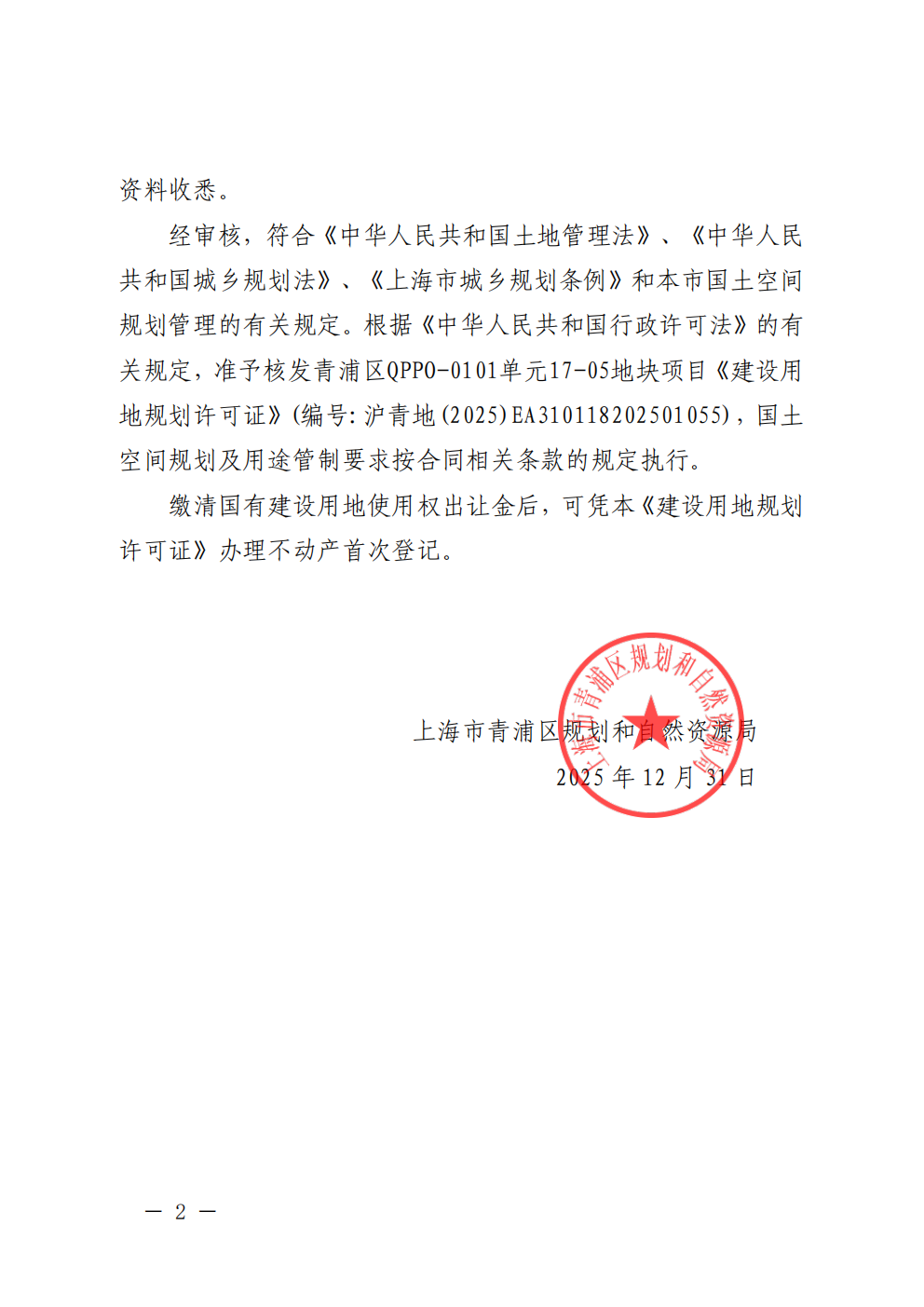 沪青地(2025)EA310118202501055建设用地规划许可公告(上海宝曜房地产开发有限公司)