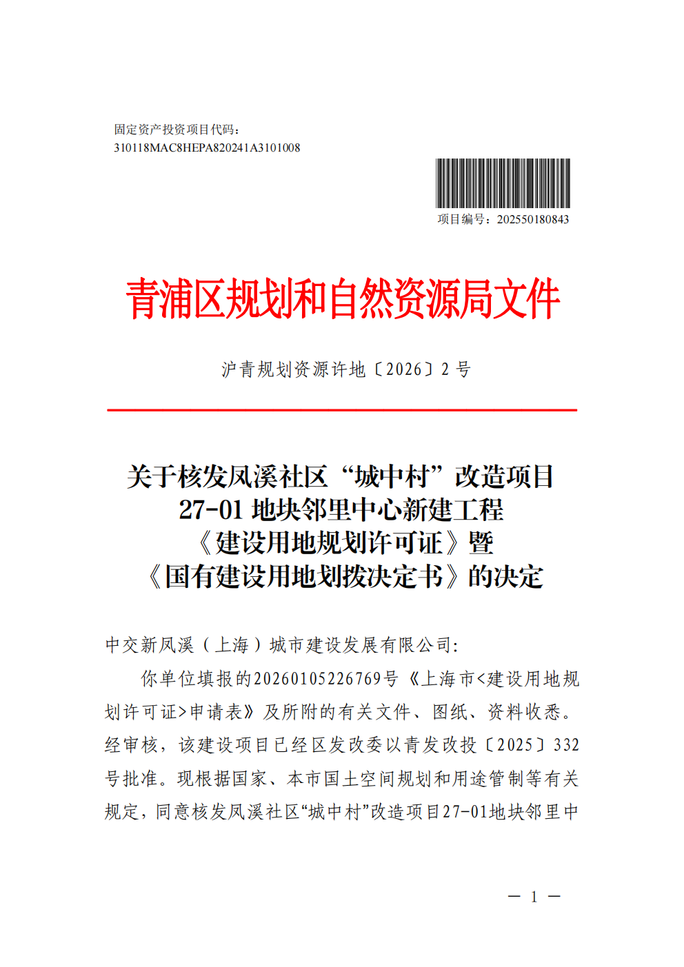 沪青地(2026)EA310118202600025建设用地规划许可公告(中交新凤溪(上海)城市建设发展有限公司)