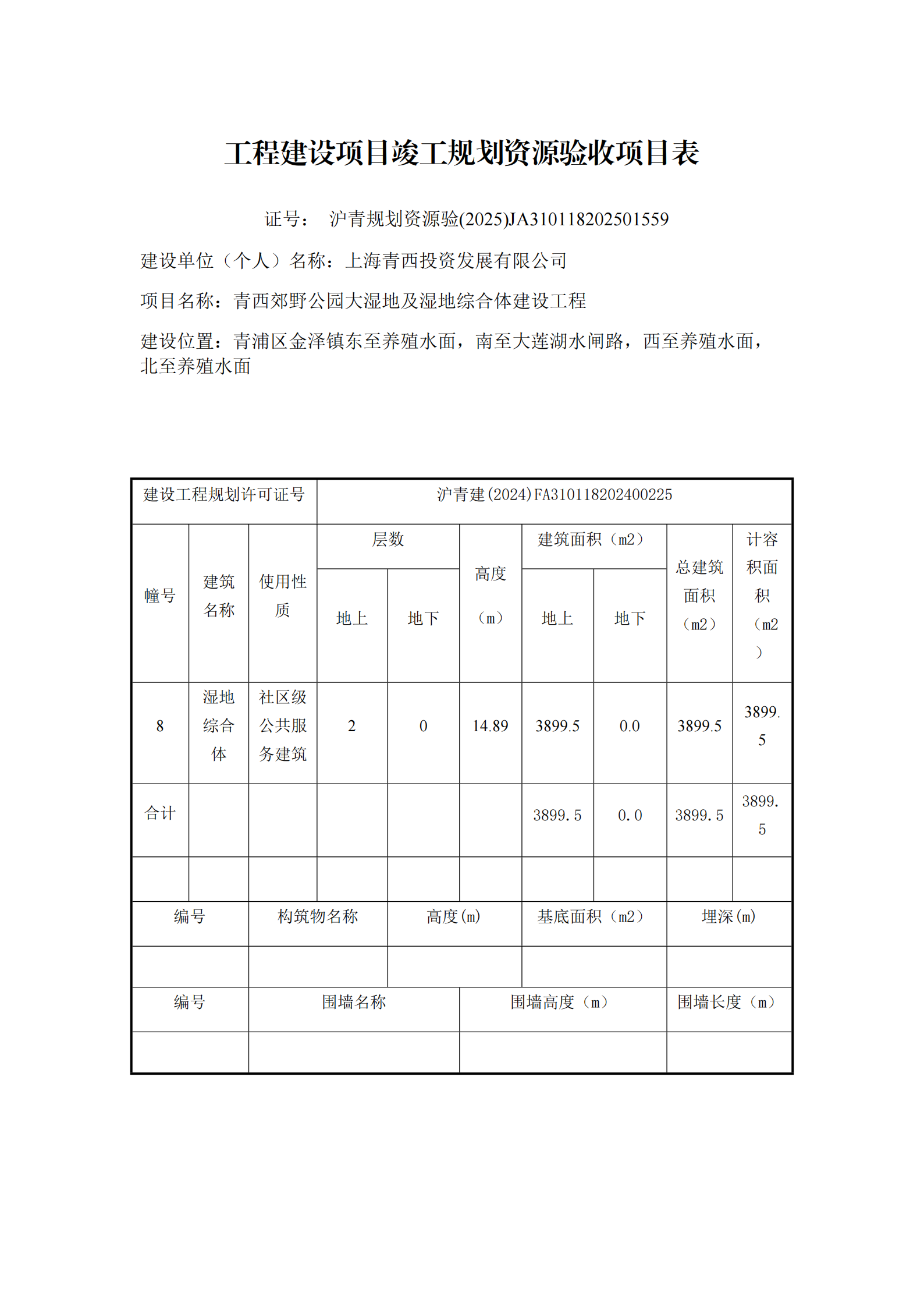 沪青规划资源验 (2025)JA310118202501559上海市工程建设项目竣工规划资源验收合格证(上海青西投资发展有限公司)