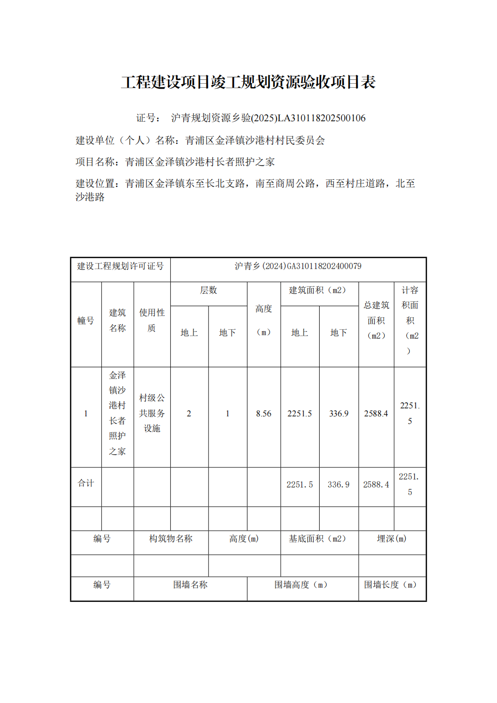 沪青规划资源乡验 (2025)LA310118202500106上海市工程建设项目竣工规划资源验收合格证(青浦区金泽镇沙港村村民委员会)