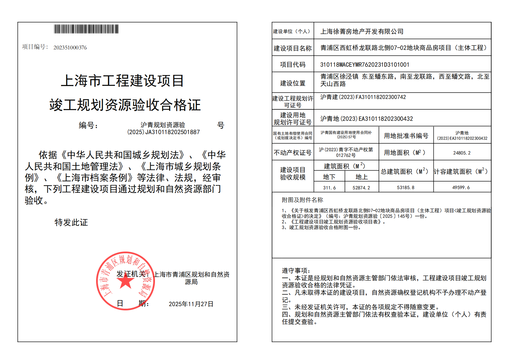 沪青规划资源验(2025)JA310118202501887上海市工程建设项目竣工规划资源验收合格证(上海徐菁房地产开发有限公司)